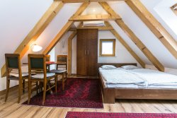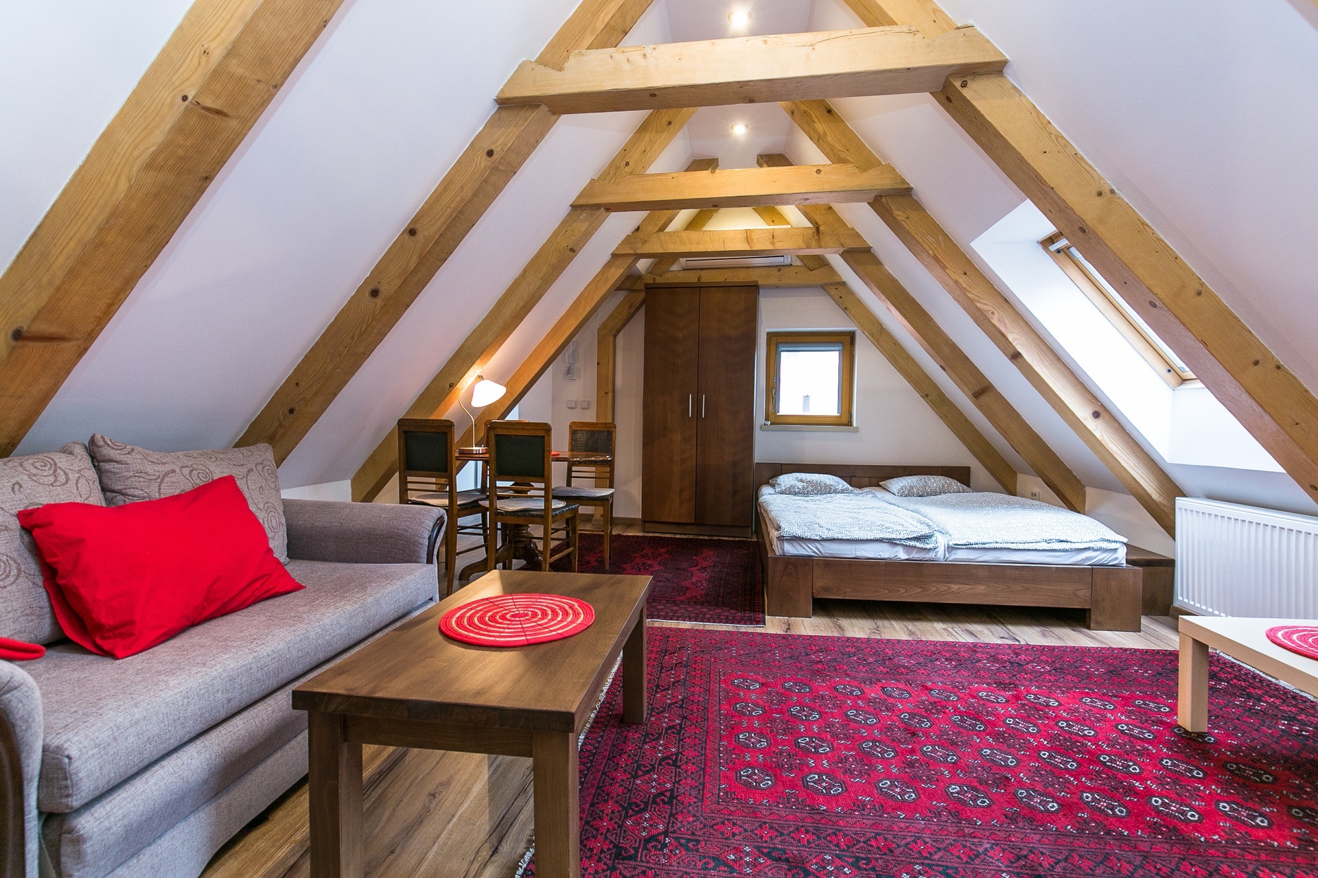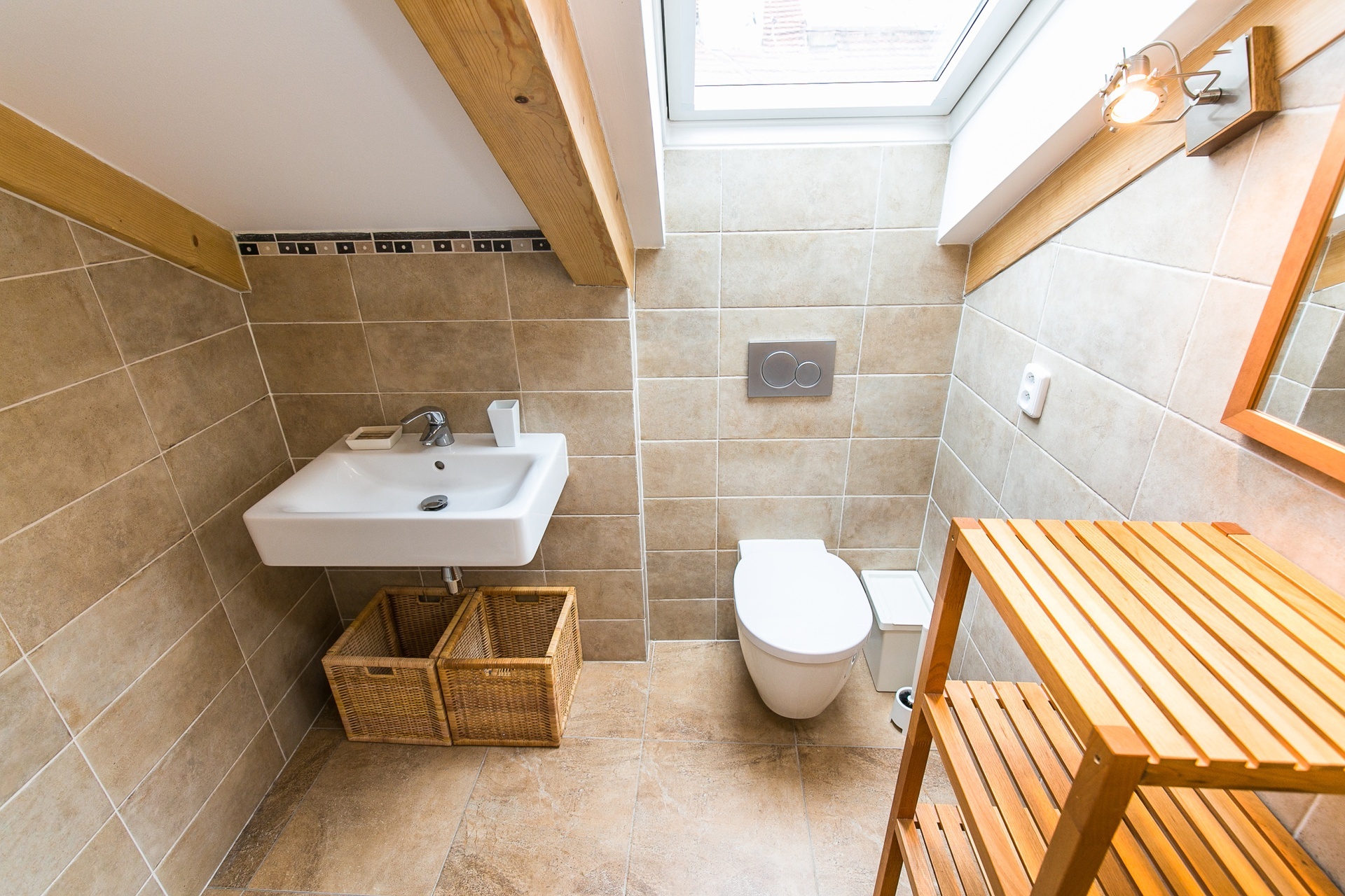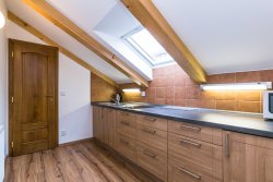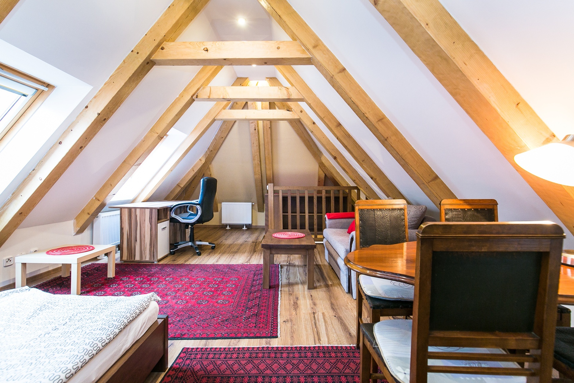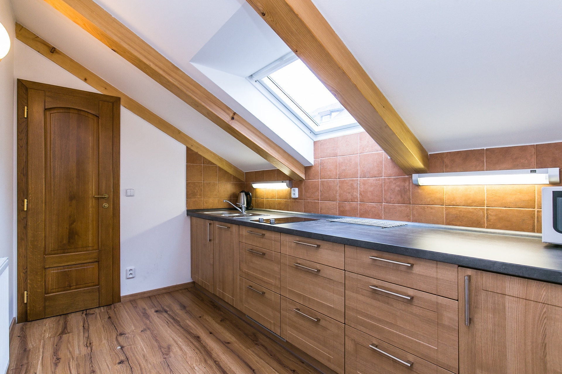 Layout includes entrance hall, spacious room with double bed, sofa, dining and work desk, modern kitchen (induction hob, fridge, dishwasher, microwave) and bathroom with shower and toilet. The historic house from 1586 is listed as a cultural monument and has many original features. The building was rebuilt in the Baroque style at the end of the 17th century. The layout of the interior and the facade was done in the classical style in the 1st quarter of the 19th century.