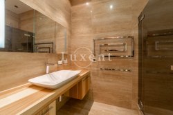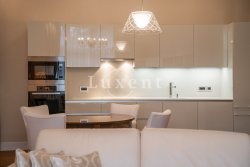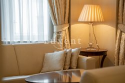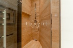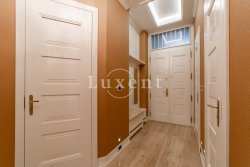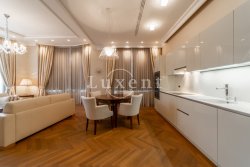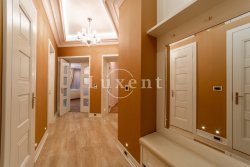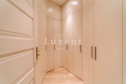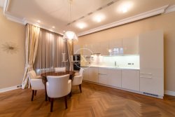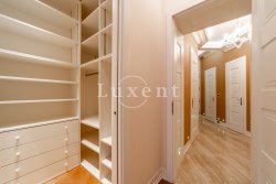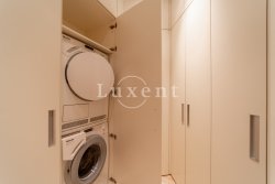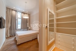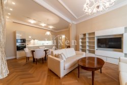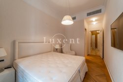The layout of the apartment includes a spacious entrance hall with built-in wardrobes (8.1 sqm), separate toilet (1.5 sqm), living room (22.5 sqm) with a modern kitchenette equipped with all Miele appliances (induction hob, oven, microwave, fridge with freezer) and a bedroom (17.9 sqm) with a luxury ViSpring bed, wall-mounted TV and a spacious wardrobe. The bedroom is connected to a designer bathroom (3.2 sqm) with a sink and shower. The dressing room in the hall is also very handy, there are floor-to-ceiling wardrobes as well as a built-in Miele washing machine and tumble dryer. All rooms have high ceilings, wooden parquet flooring, air conditioning and plenty of storage space. The furnishing of the apartment is carried out to a high standard, which corresponds to the current requirements for quality living. Timeless natural colours, built-in lighting and sound systems are used throughout the apartment.