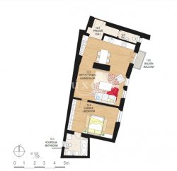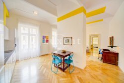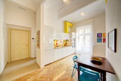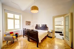 The interior features an entrance hall, bedroom with double bed and storage, en-suite bathroom with bath and toilet, living room with kitchenette, dining table, sofa and work desk. The kitchen is equipped with all appliances - induction hob, hood, hot-air oven, microwave, dishwasher and fridge / freezer. Another separate toilet is located at the entrance hallway. Wooden parquet, preserved original features, security door, TV, washing machine, own gas boiler.