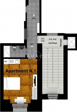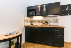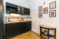 The layout includes an entrance hall, two modern bathrooms (bath and shower) with toilet and two separate studios with kitchenette, double bed (beds can be divided into single beds), storage space and a relaxation area with armchair. Both rooms are complemented by original Old Prague views / photographs from the pre-war period. Furniture decorated in an elegant black color can be stored; there is variability in the layout of the rooms if the tenant needs it. The kitchen is equipped with appliances including a dishwasher. The apartment has quality tiles and refurbished wooden floors; There is satellite TV, internet and mobile air conditioning.