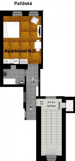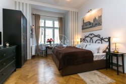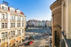 We offer for rent an exquisitely furnished apartment, which was created by combining two studios. Furnished apartment with views of the Church of St. Nicholas and the Old Town Square are located on the 3rd floor of a neo-baroque house by architect Jan Koula on the prestigious Pařížská Street.