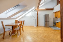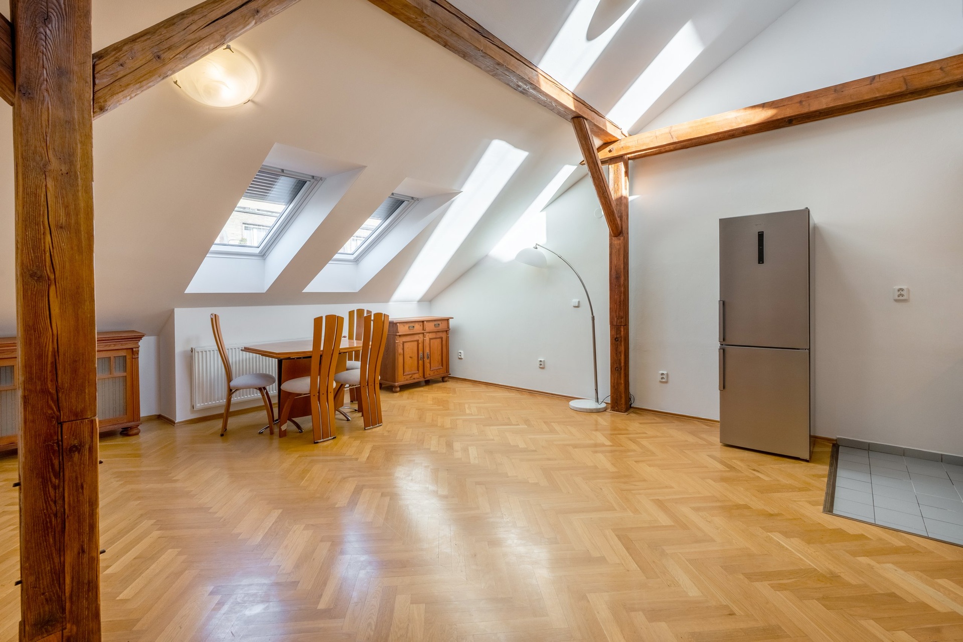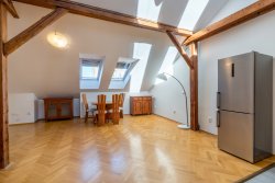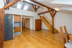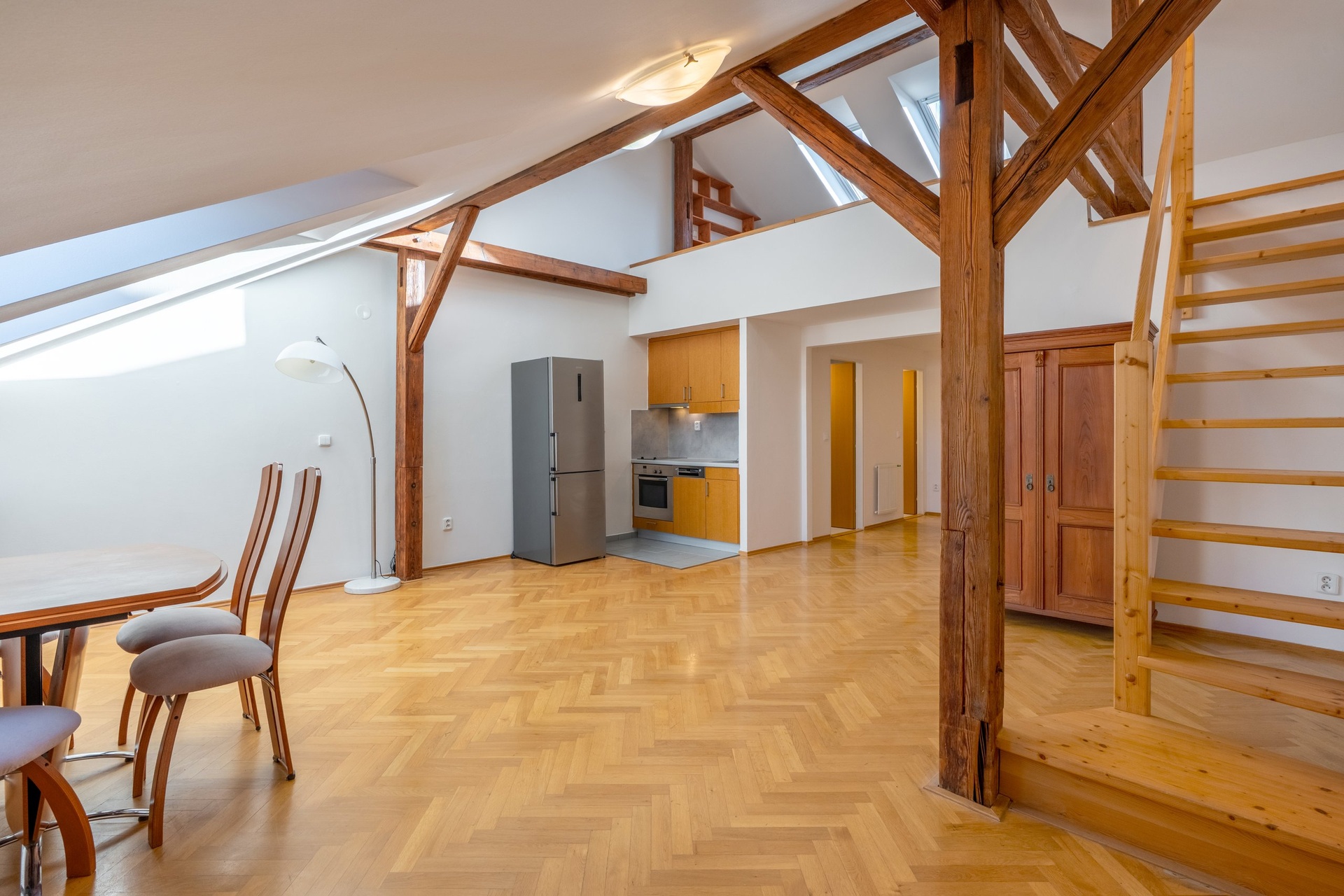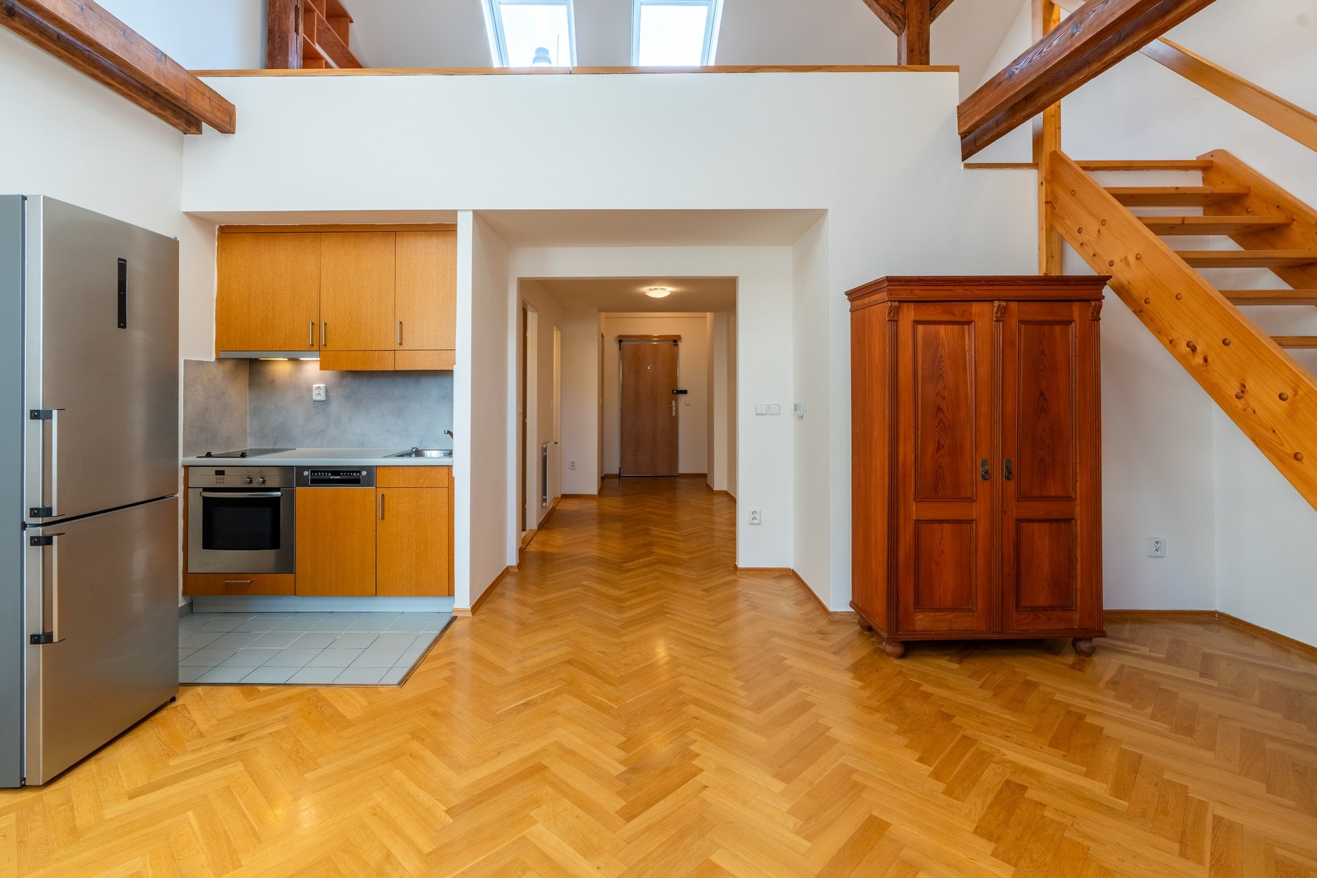We offer for rent a 2+kt duplex apartment with a usable area of 63 sqm located on the 5th floor of an apartment building with an elevator. The duplex apartment is very nice, partially furnished, and located in the sought-after Prague neighborhood of Holešovice.