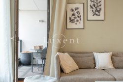 Both the living room and the bedroom have access to a terrace with a seating area. 24-hour reception with security and additional services, security doors, quality French windows with triple glazing, washer-dryer. Wooden floor and heated pavement in the bathroom. Many storage compartments and built-in custom-made furniture.