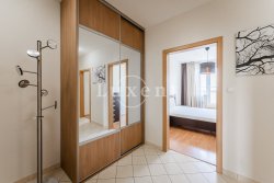 The layout includes an entrance hallway with built-in wardrobes, living room with kitchenette and access to the south-facing balcony with a beautiful view of the surroundings, two bedrooms with access to a shared terrace, a storage room, bathroom with bathtub and a separate separate toilet. The kitchen is equipped with Bosch appliances - hob, extractor hood, hot air oven, dishwasher, fridge with freezer, microwave. Security doors, floating floors and tiles, bike or pram storage is also available.