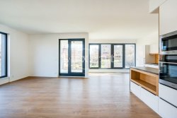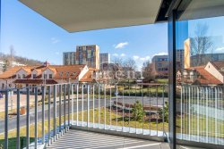 The 94 sqm apartment is located on the second floor of a new building with a lift. Beautiful wooden floors, large windows overlooking the greenery, spacious bathroom with shower, separate toilet, two bedrooms and a generous living room with access to the terrace. The kitchen is custom made with plenty of storage space and is equipped with all electronic appliances - fridge/freezer, large dishwasher, glass ceramic hob, Franke extractor hood, oven and microwave. The apartment has a video phone and a security class three entrance door. The apartment has a cellar of 3,5 m².
