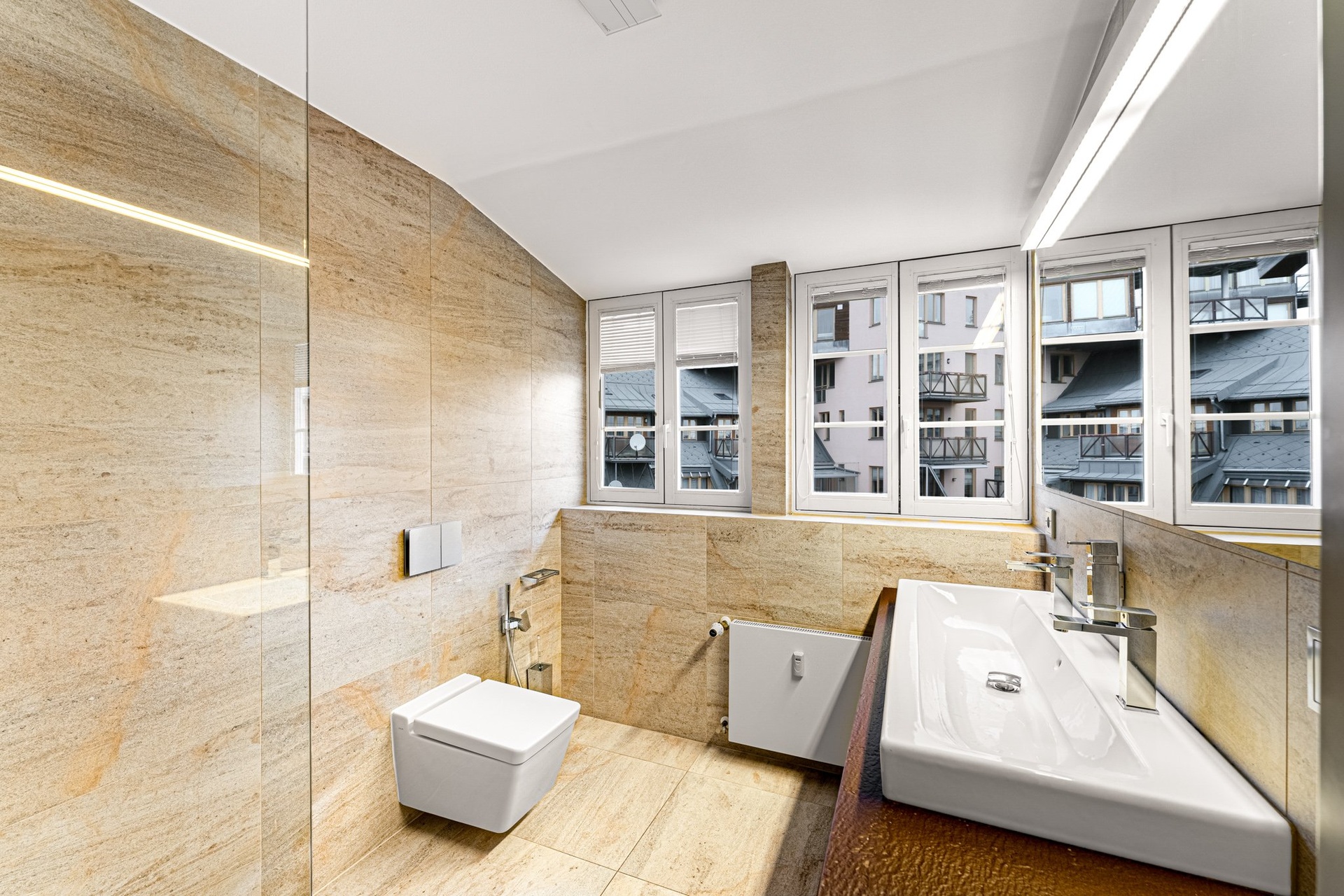 On the lower level of the duplex, you will find an entrance hall with a staircase, built-in wardrobes, and entrances to two separate, fully equipped bedrooms – also with built-in wardrobes. The master bedroom also has a balcony overlooking the quiet green courtyard. Underground garages are available, and 2 parking spaces are included in the rent for this specific apartment.
