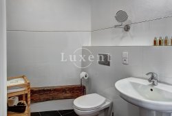 The layout includes a living room with two sofa-beds, an armchair and a TV, a dining table with eight chairs, and a kitchenette with an island. The kitchen is fully equipped with all appliances including dishwasher. Behind the living room there is a master bedroom with a double bed and a private bathroom with shower, toilet and bidet. There is also a terrace with entrance from the living area of the apartment. On the other side of the apartment is a hallway, which enters two separate bedrooms with double beds and bathrooms with bathtub and toilet, and a separate toilet. In the apartment there are laid quality tiles and wooden floors; There is satellite TV, internet.