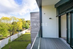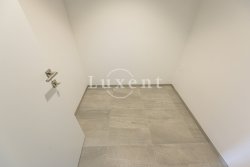 The layout includes the entrance hall, spacious living room with kitchenette and access to the terrace, master bedroom with en-suite bathroom and access to the second terrace, two walk-in closets, two bathrooms with toilet, and a separate toilet. There is a nonstop reception with security and additional services, security doors, large-format aluminum windows, air-conditioning or electric outdoor blinds. There are quality wooden floors and designer tiles in the bathroom. The rent of this real estate also includes a cellar of 8.5 sqm.