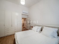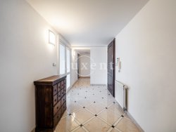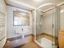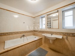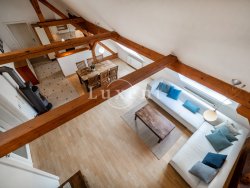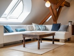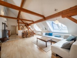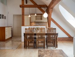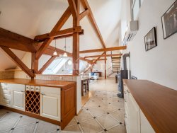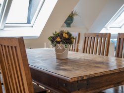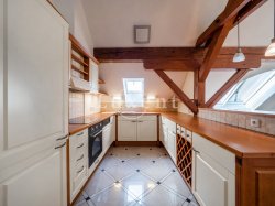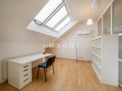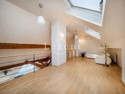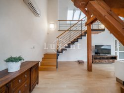 The layout of the apartment includes on the first floor a generous living room with fireplace, dining room with kitchenette fully equipped with all appliances, three bedrooms, one of which has its own en-suite bathroom with shower and also a dressing room, as well as a separate bathroom with bath, toilet and bidet and a utility room with boiler and washing machine. Upstairs you will find a separate study and a pleasant open space relaxation area. The apartment uses high quality parquet and tiled floors and preserved wooden beams. All rooms are air conditioned. The windows in the living area offer impressive views of the Church of Salvator and the Old Town. A security system is also an essential part of the property.