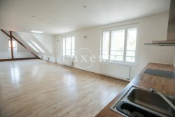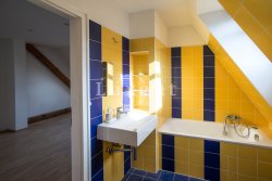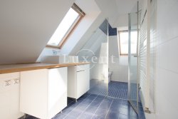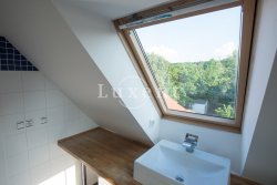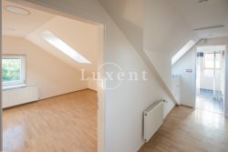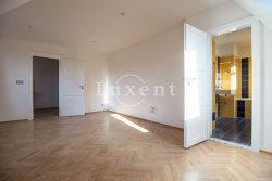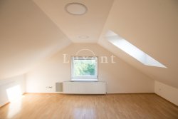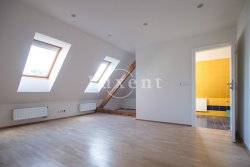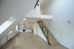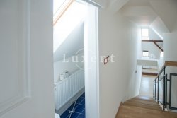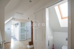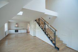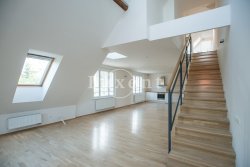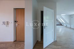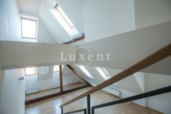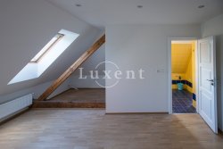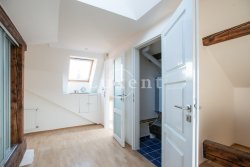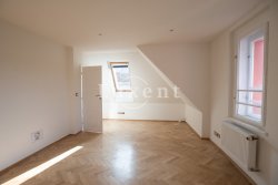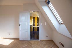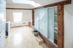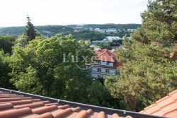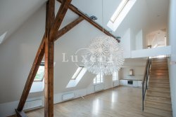 In a quiet residential area of Košíře in Prague 5 we offer for rent an apartment of 181 sqm, layout designed as 5+kt. This apartment unit is located on the 3rd and 4th floor of a villa without a lift of a total of 5 apartments. On the lower floor there is an entry hall of 13.7 sqm, a separate toilet of 1.5 sqm, a chamber and two rooms of 21.5 and 23.5 sqm, connected by a bathroom of 6.9 sqm with a bathtub and sink, and a residential room with kitchen 57.6 sqm with a high ceiling. The kitchenette offers full equipment such as fridge, freezer, Bosch cooker and Miele dishwasher.