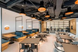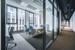 It includes extensive representative relaxation zones, open space areas for work or informal meetings. Of course, the use of several meeting rooms is included in the rental price. Fully equipped kitchens with unlimited coffee, tea and water are available for you and your clients.