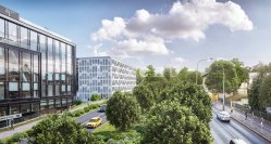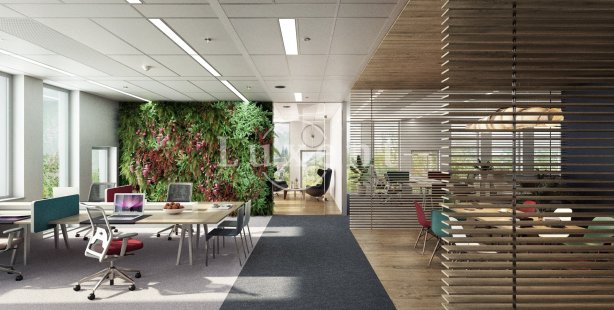 The class A office space is spread over 6 floors and offers up to 18,600 sqm of leasable office space. All floors have the possibility of flexible space layout. Tenants can thus use the layout as a large open space or as smaller separate units. The building is targeting BREEAM Very Good certification. The premises are equipped with reception, opening windows, air conditioning, fibre optic cables and security. Access to the building works via magnetic cards. The building includes a cafeteria with a café.