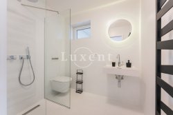 The house also has three bedrooms, two of which have separate access to the garden. The third bedroom has its own spacious dressing room and a separate bathroom with shower and toilet. Hallway with spacious fitted wardrobes and a luxurious Kartell designer bathroom with bath, basin and toilet.