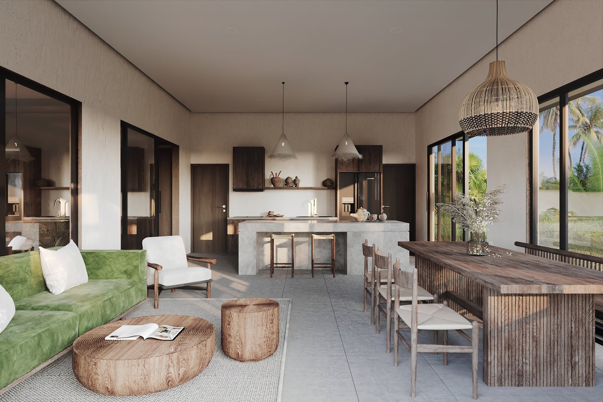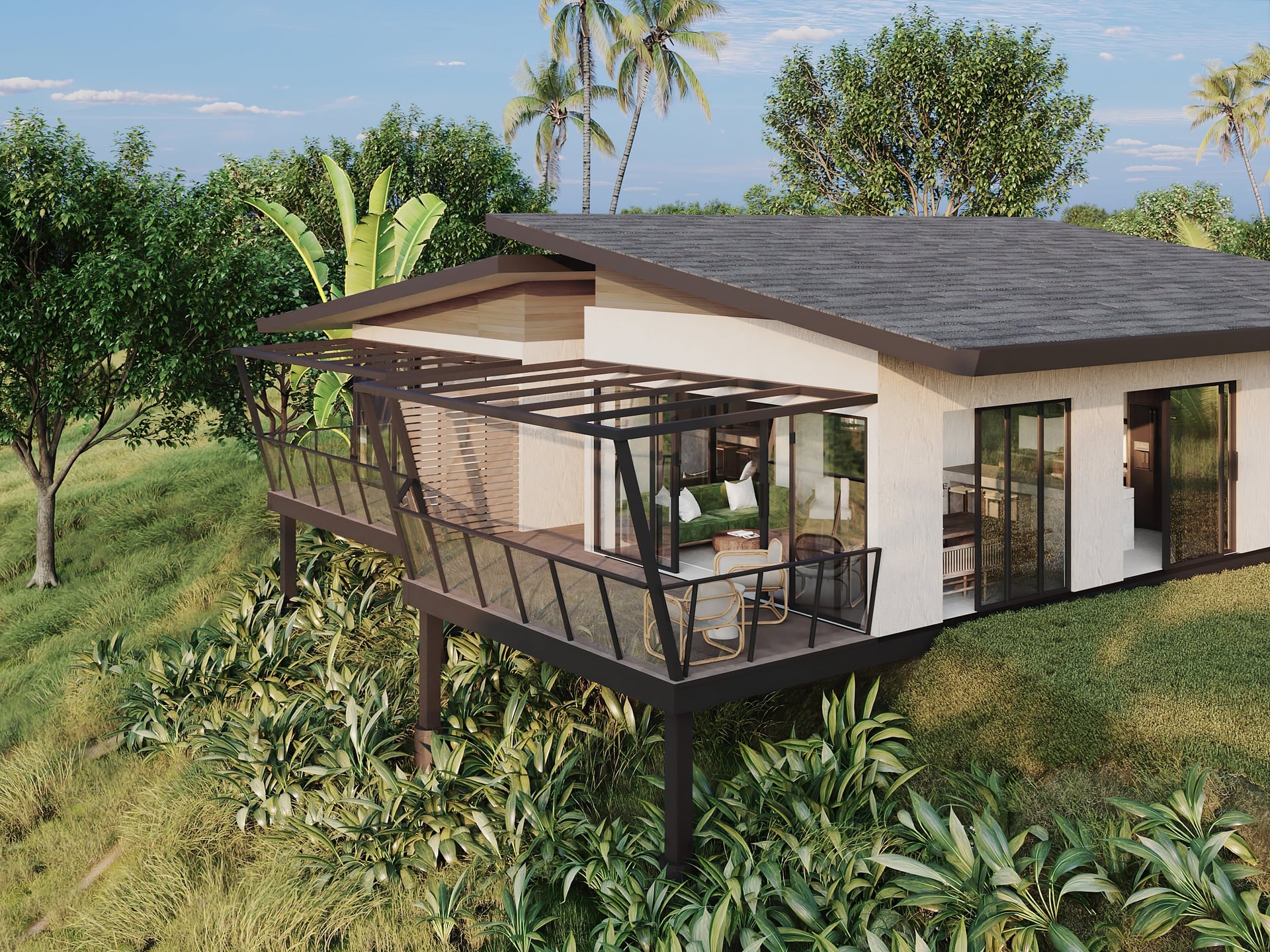 You can choose from houses in three variants - one, two or three bedrooms. The layouts are variable and can be modified as desired. The social living area of the interior is separated by a practical entrance hall from the bedrooms and bathroom. The attractive and functional minimalist design of the houses is complemented by extensive private grounds with spring water, mature trees and a fertile garden where you can harvest your own tropical fruits. In addition to the pleasant atmosphere of the design house, you will therefore also get your own unique rich green privacy. The interior materials are wood and ceramic tiles, but you can choose from many types of superior tropical wood floors.