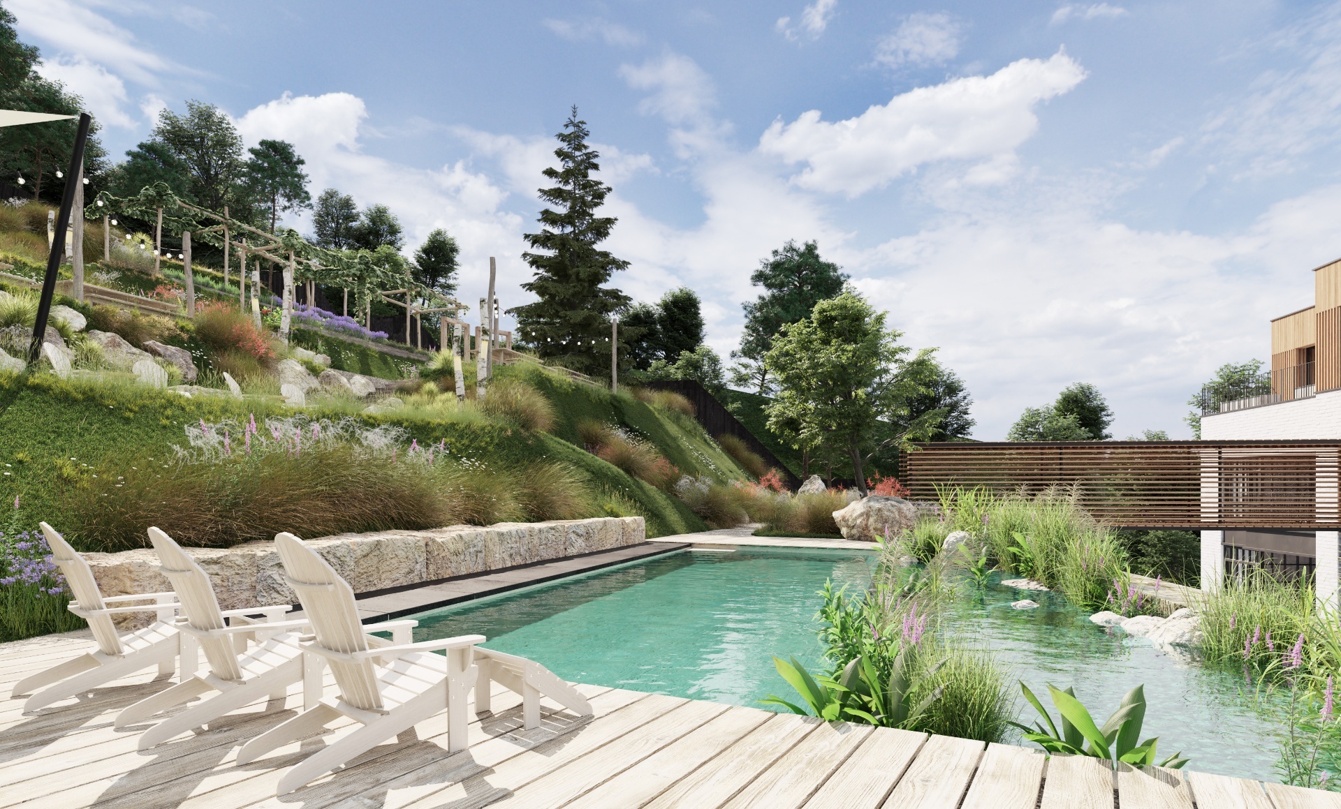With the apartments, the owners get an exceptional property and with it a space for healthy living and green assets - a terraced, creatively designed garden with trees, a workout zone and a garden pool, accessible to all residents for active and passive relaxation.