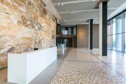 The all-glass façade not only ensures plenty of daylight, but also brings treasured views. Right from the four floors you can access the terraces. Original materials are used throughout the project.