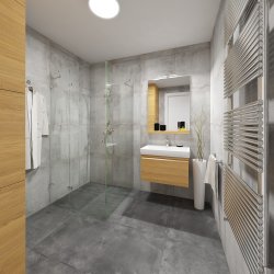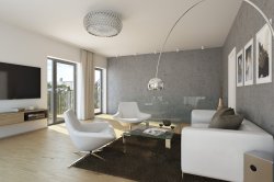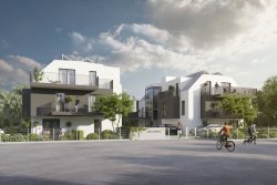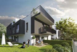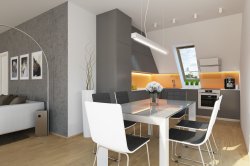 There are apartments with 3+kt and 4+kt layouts, each with its own terrace, loggia or garden. The equipment of the apartments meets the highest standards. Wooden windows and patio doors with triple glazing in anthracite colour and thermally insulated wooden roof windows with double glazing. In the living rooms there is a wooden multi-layer glued floor combined with elegant 60x60 tiles in two standards (Villeroy & Boch grey, Abitare anthracite imitation concrete). Ceramic wall tiles in the bathrooms also in two standards (30x60 Villeroy & Boch white, 60x60 Abitare grey imitating natural concrete).