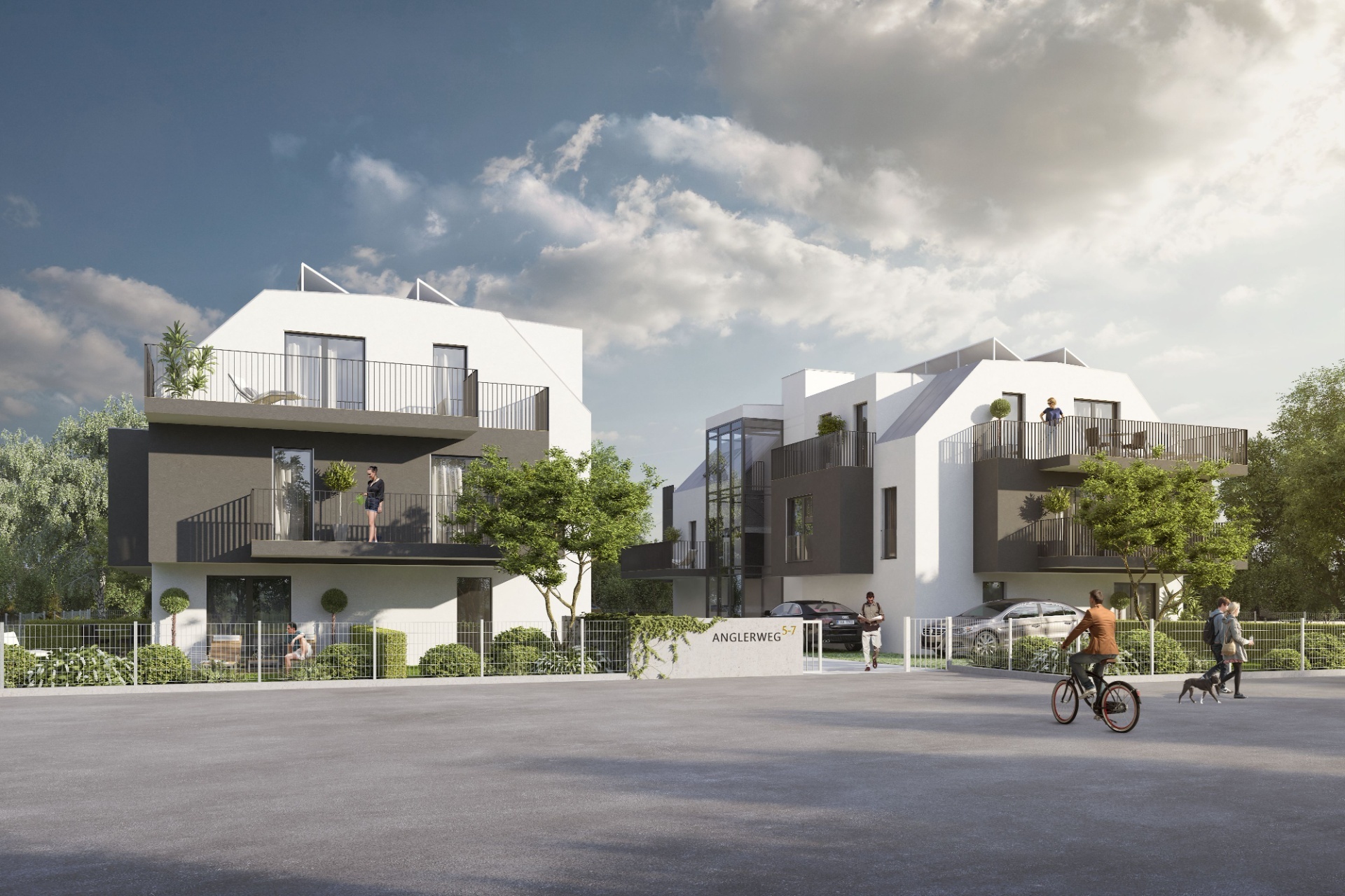 Anglerweg is an exclusive residential project of two apartment buildings with a total of 12 apartments in the heart of Vienna's Kaisermühlen district, which lies between the banks of the Old and New Danube. The project is built in a low-energy standard, thanks to a central heating system with its own central boiler house and a solar system on the roof, which brings a significant reduction in operating costs and an improvement in the ecological balance of the building. The insulated façade is covered with thin-film plaster, while the pitched roofs are covered with flat metal sheeting and a walking layer.