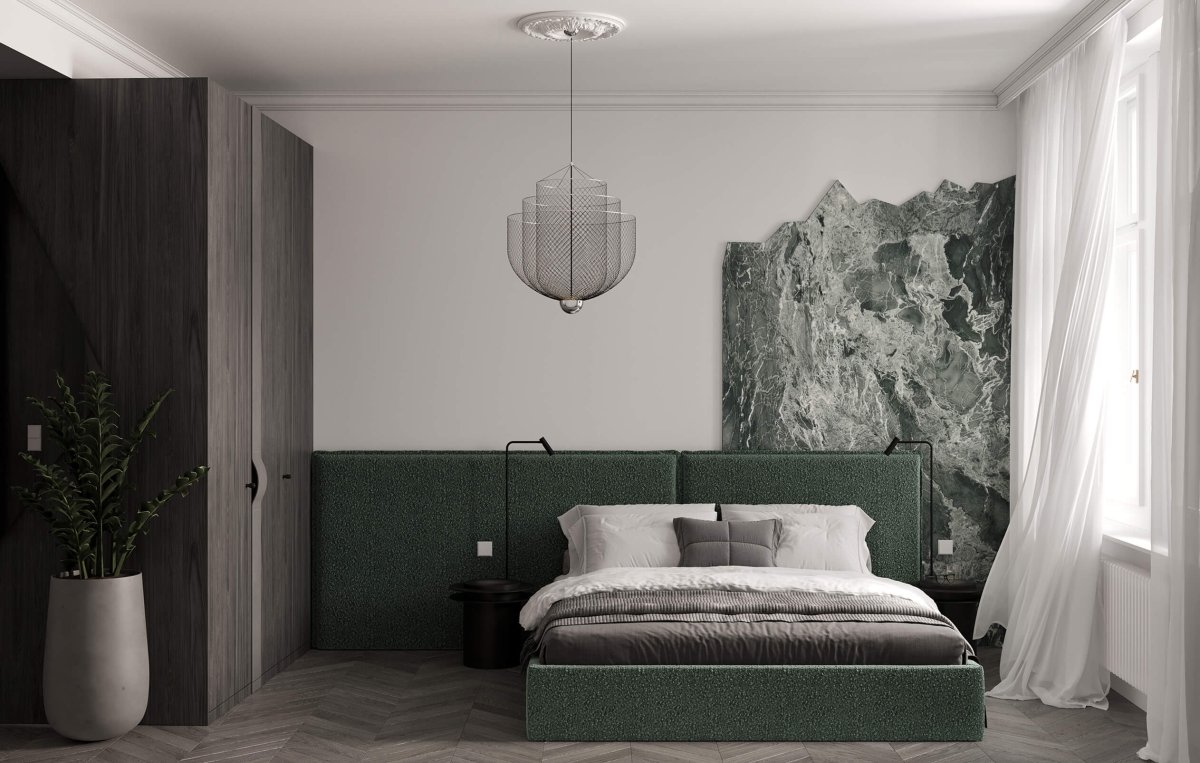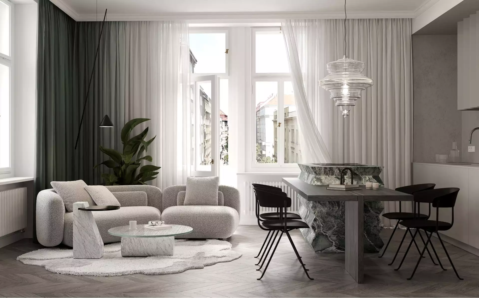The project is designed to a high standard. The living space is complemented by FREVINI MONACO wooden flooring, laid in a chevron pattern. The interior doors combine classic wooden elements with steel glass doors with textured and clear glass, emphasizing the modern character of the space. The electrical installation features JUNG LS 990 designer switches and sockets. The apartment is equipped with recessed McLED TORO spotlights and, of course, a wall-mounted air conditioning unit to ensure comfort in the summer months. The bathroom is equipped with LAUFEN KARTELL sanitary ware, and EMIL CERAMICA ceramic tiles in modern shades give the bathroom a timeless look.