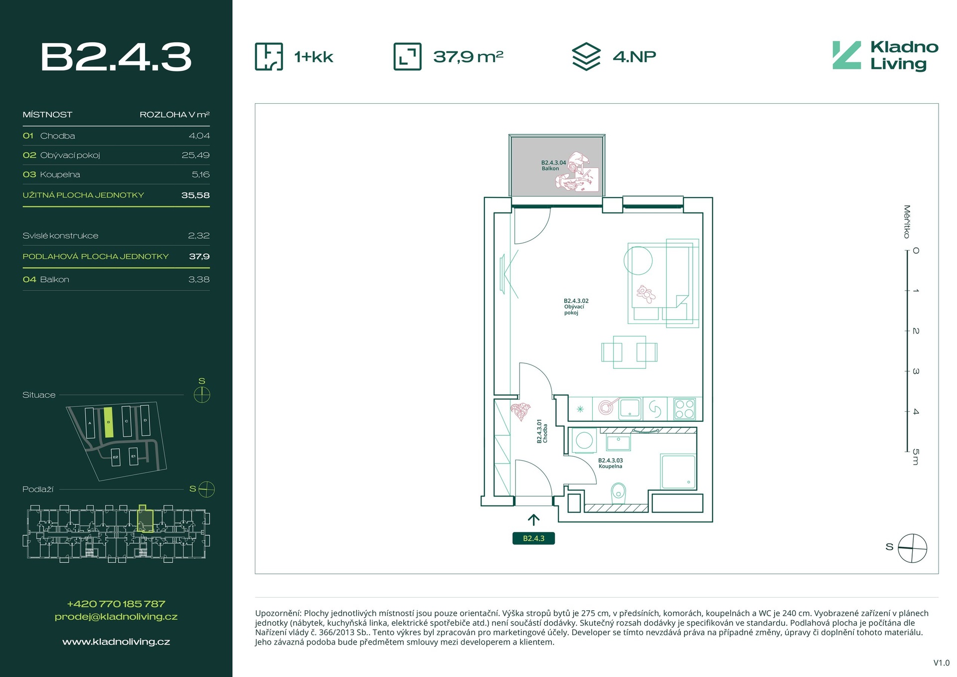 | KL-B126 | 1 + kitchenette | 1st floor | 36 m2 | 38 m2 | No / 3 m2 / No | No | 4 580 000 CZK | Detail |