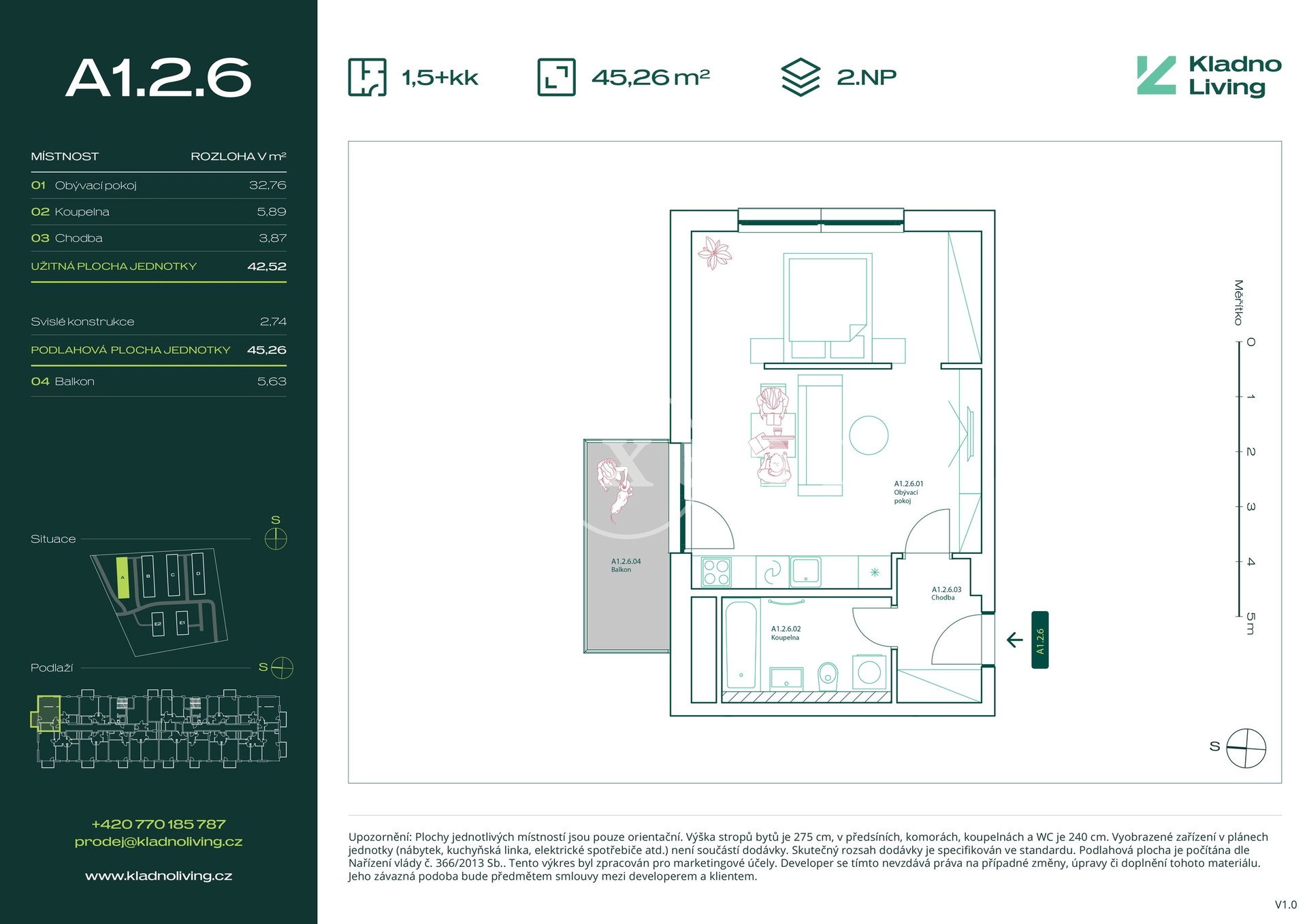 We are offering for sale a modern apartment 1+kt (1,5+kt) with a floor area of 45,2 sqm and a balcony of 5,6 sqm in the Kladno Living residential project, which is being built in one of the most attractive locations in the city of Kladno – Kročehlavy. This new development project represents a unique opportunity for those looking for new apartments in Kladno or an investment in real estate with high appreciation potential.