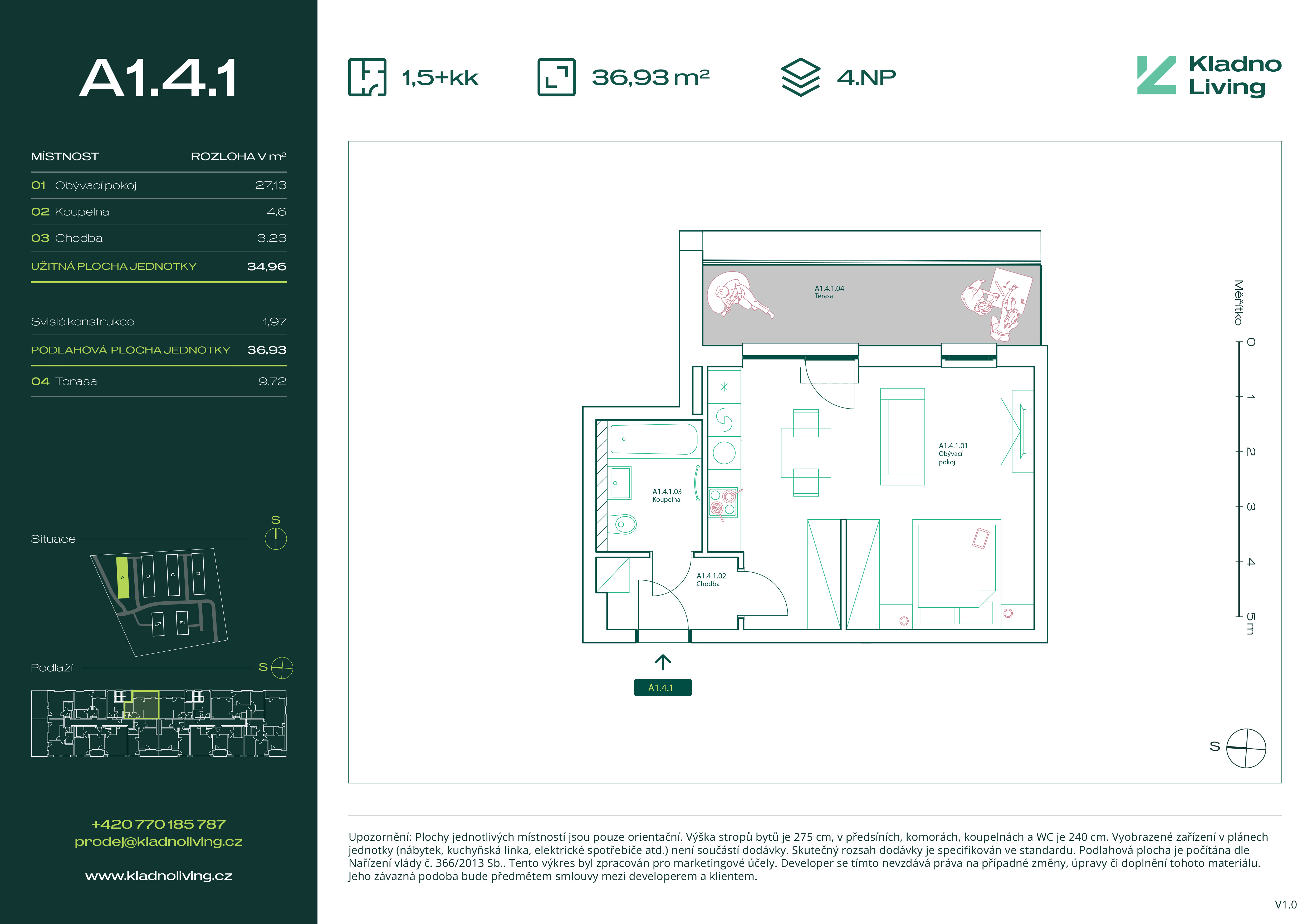 We are offering for sale a modern apartment 1+kt (1,5+kt) with a floor area of 36,9 sqm and a terrace of 9,7 sqm in the Kladno Living residential project, which is being built in one of the most attractive locations in the city of Kladno – Kročehlavy. This new development project represents a unique opportunity for those looking for new apartments in Kladno or an investment in real estate with high appreciation potential.