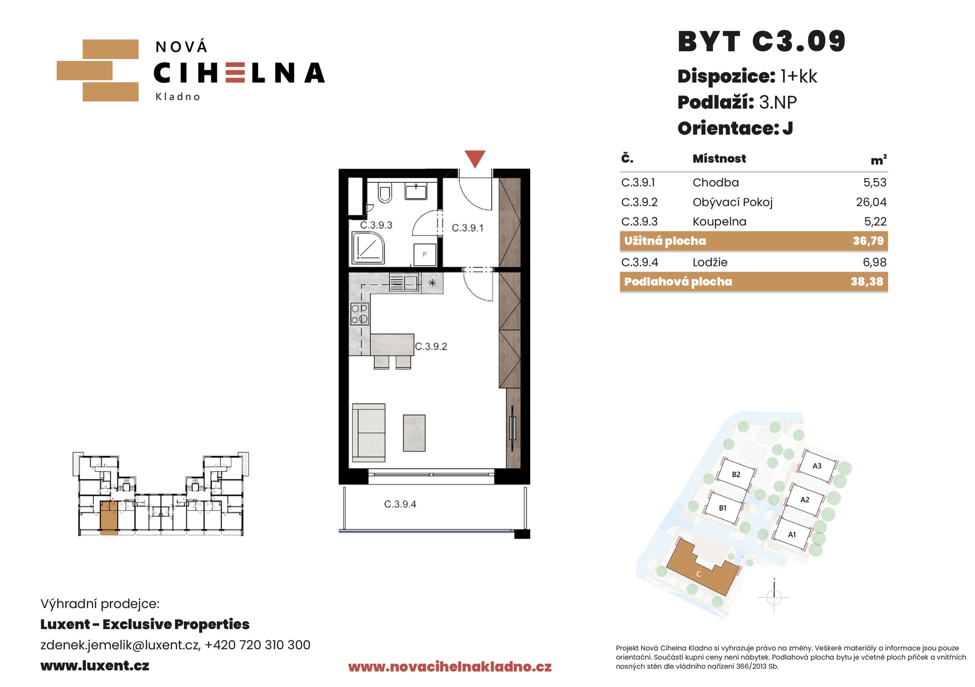 We offer for sale apartment 1+kt with a floor area of 38.38 sqm with a loggia of 6.98 sqm in an extremely economical development project Nová Cihelna Kladno, located in the urban area of Kladno - Rozdělov.