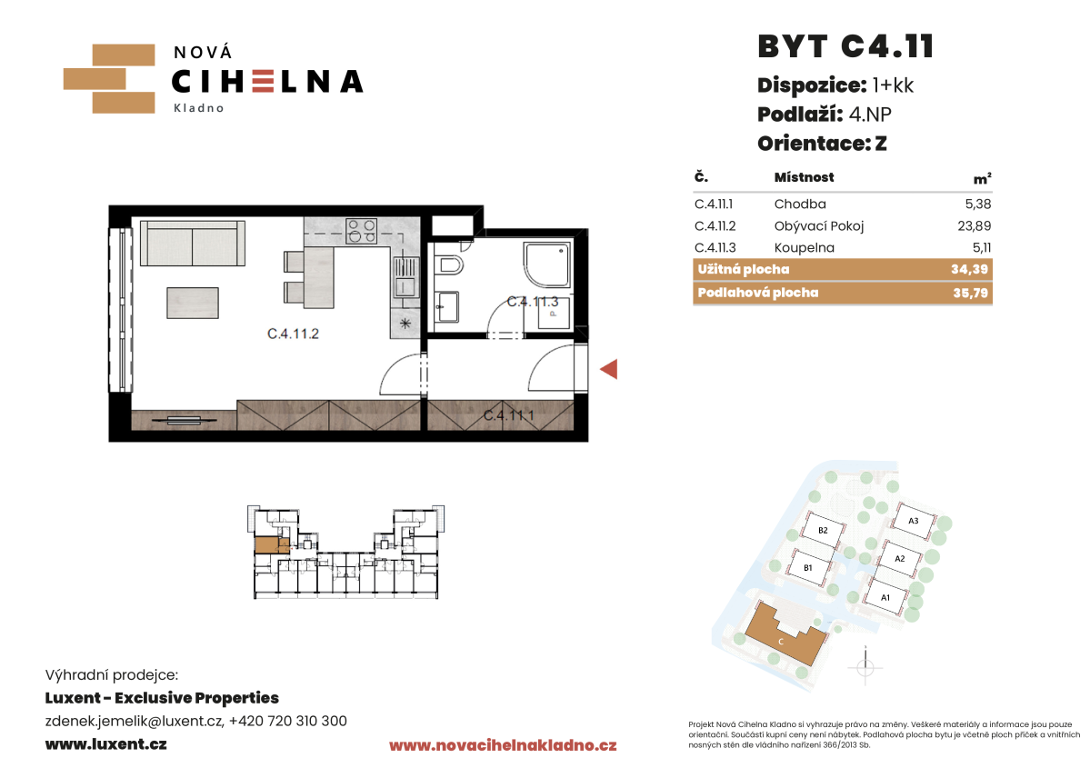 We offer for sale apartment 1+kt with a floor area of 35.79 sqm in the extremely economical development project Nová Cihelna Kladno, located in the urban area of Kladno - Rozdělov.