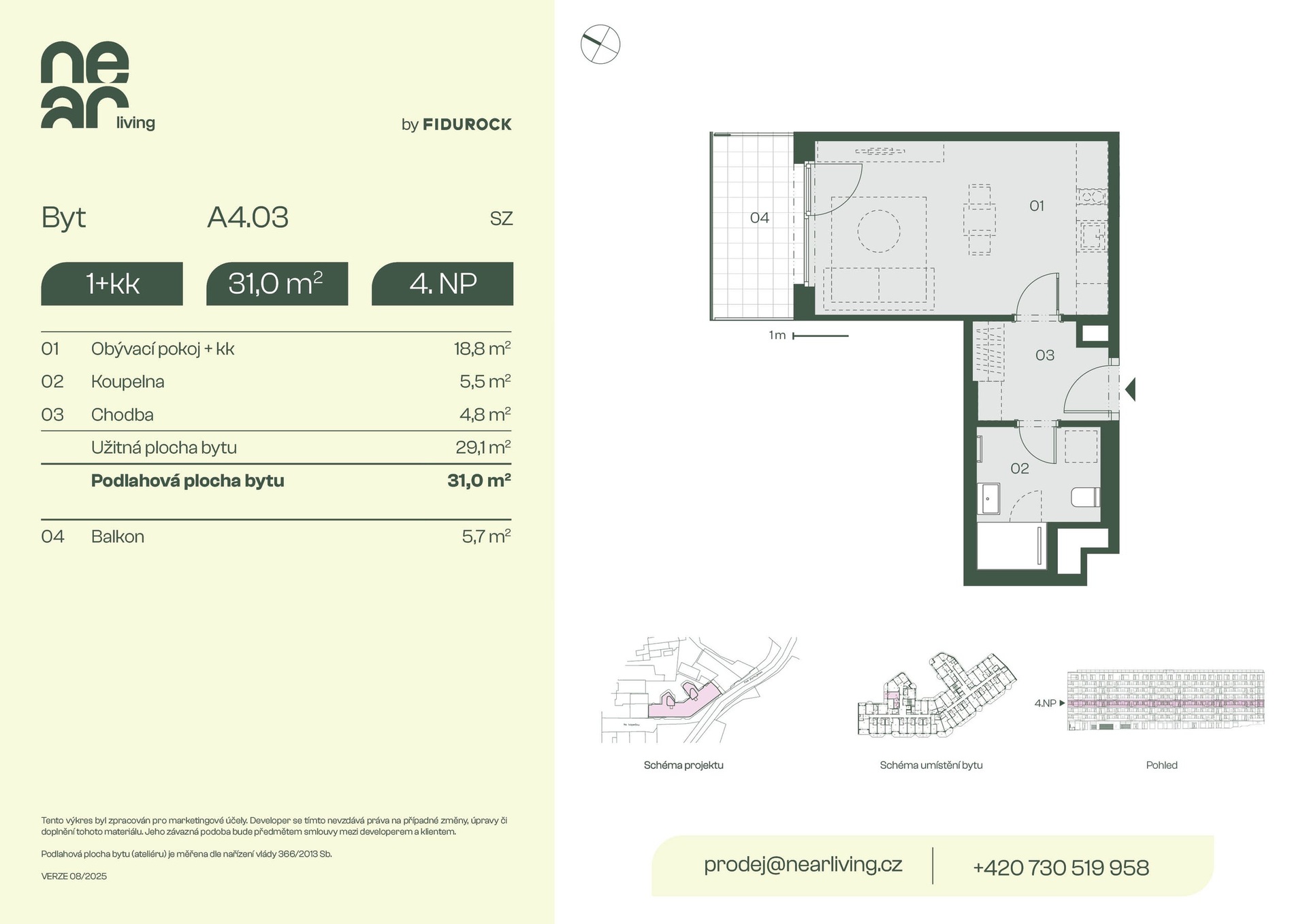 We offer for sale a 1+kt apartment with a floor area of 31 sqm and a balcony of 5.7 sqm in the NEAR living development project in Prague 8, located on the border between Palmovka and Karlín.
