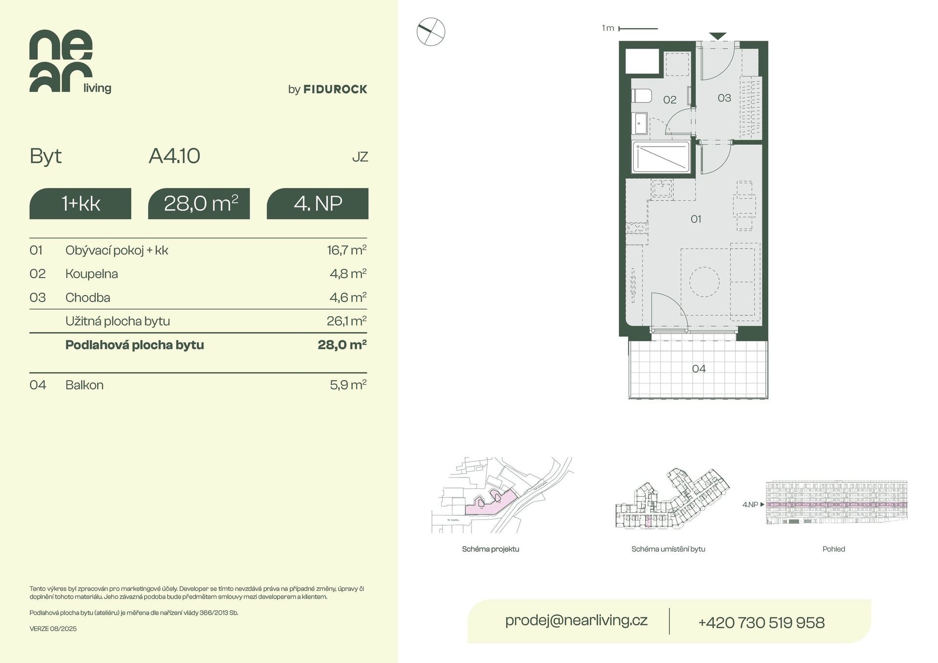 We offer for sale a 1+kt apartment with a floor area of 28 sqm and a balcony of 5.9 sqm in the NEAR living development project in Prague 8, located on the border between Palmovka and Karlín.