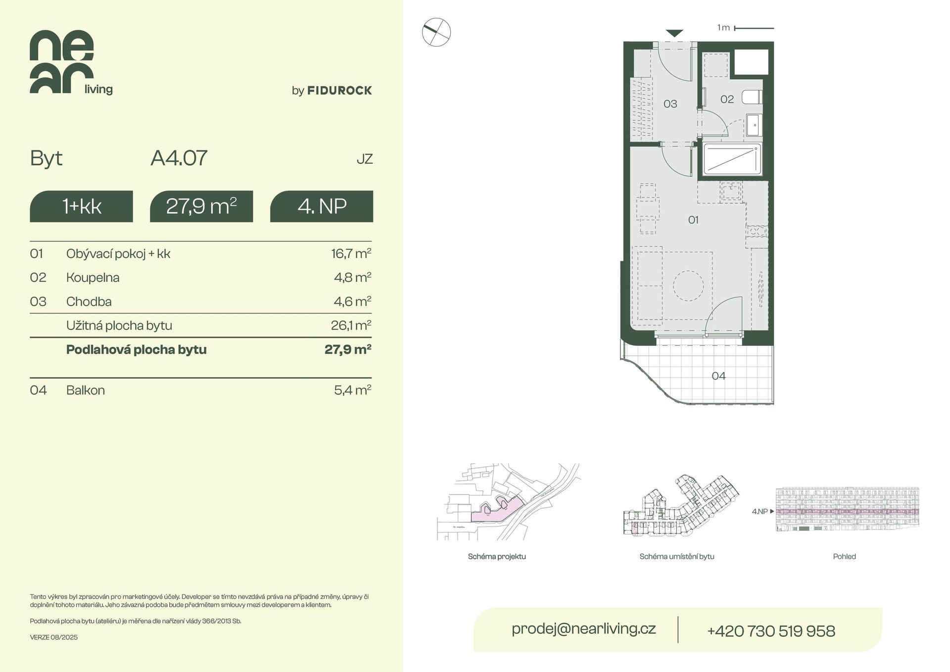 We are offering for sale a 1+kt apartment with a floor area of 27.9 sqm and a 5.4 sqm balcony in the NEAR living development project in Prague 8, located on the border between Palmovka and Karlín.