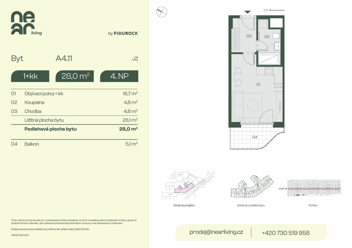 We offer for sale a 1+kt apartment with a floor area of 28 sqm and a balcony of 5.1 sqm in the NEAR living development project in Prague 8, located on the border between Palmovka and Karlín.
