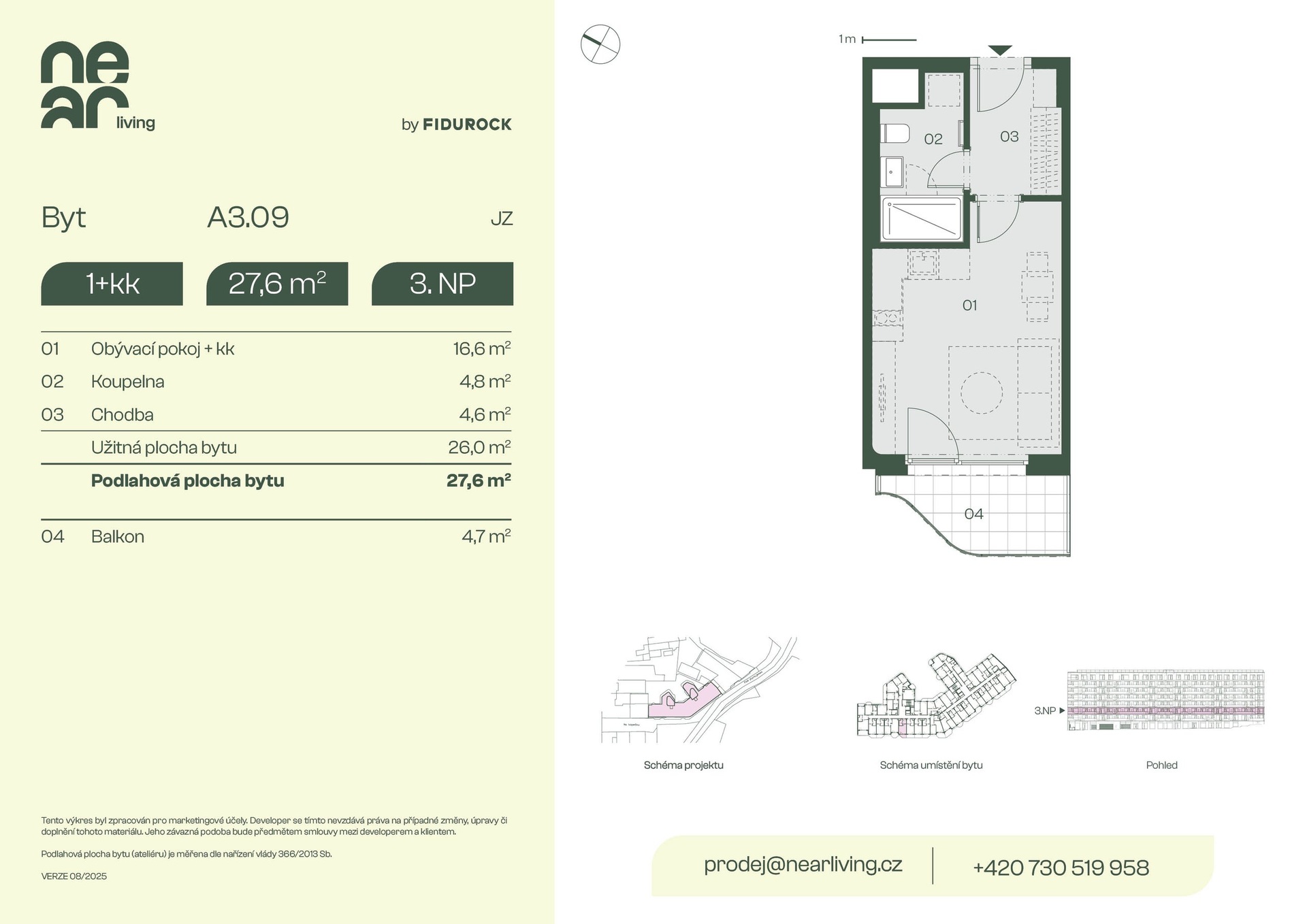 We offer for sale a 1+kt apartment with a floor area of 27.6 sqm and a balcony of 4.7 sqm in the NEAR living development project in Prague 8, located on the border between Palmovka and Karlín.