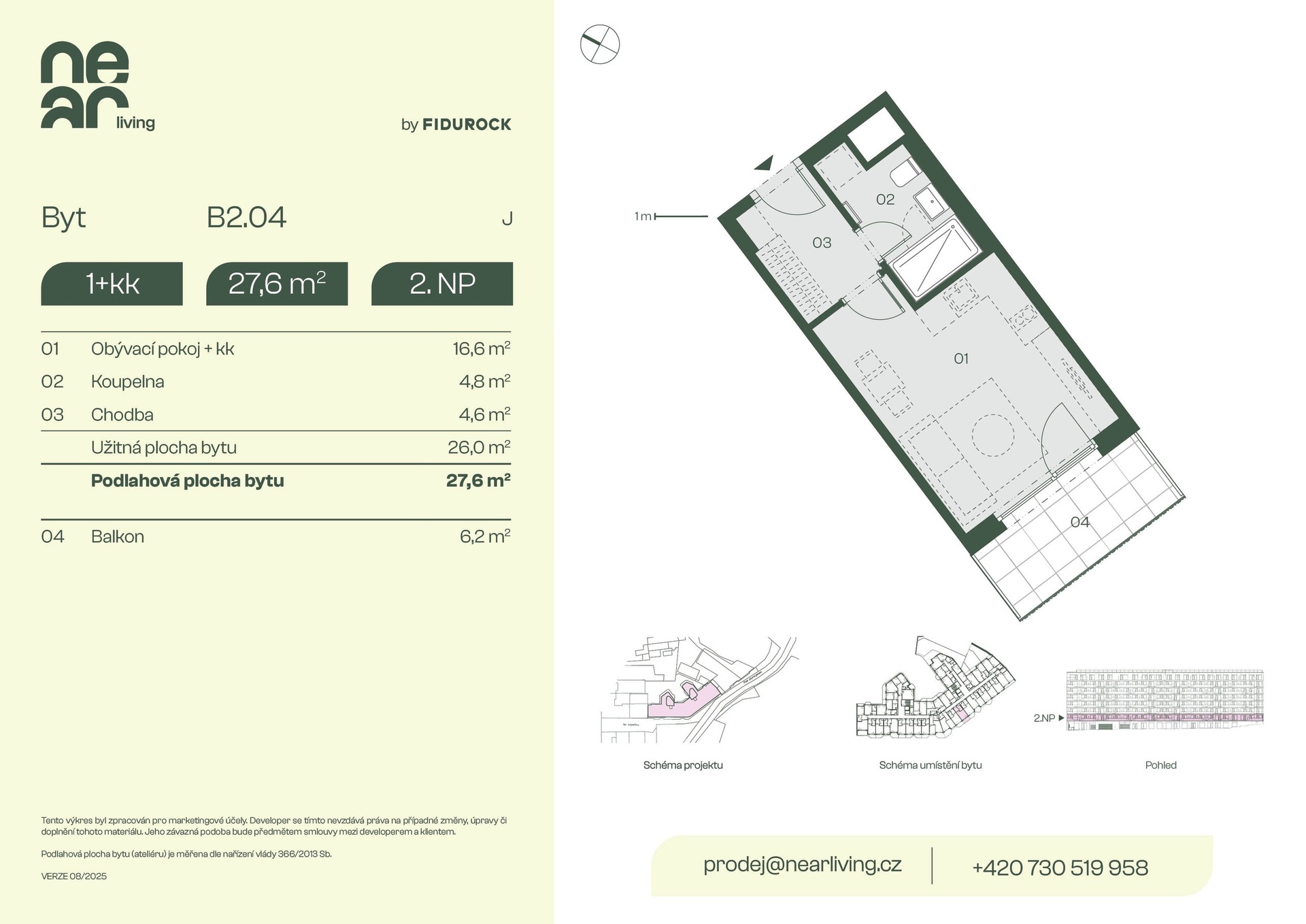We offer for sale a 1+kt apartment with a floor area of 27.6 sqm and a balcony of 6.2 sqm in the NEAR living development project in Prague 8, located on the border between Palmovka and Karlín.