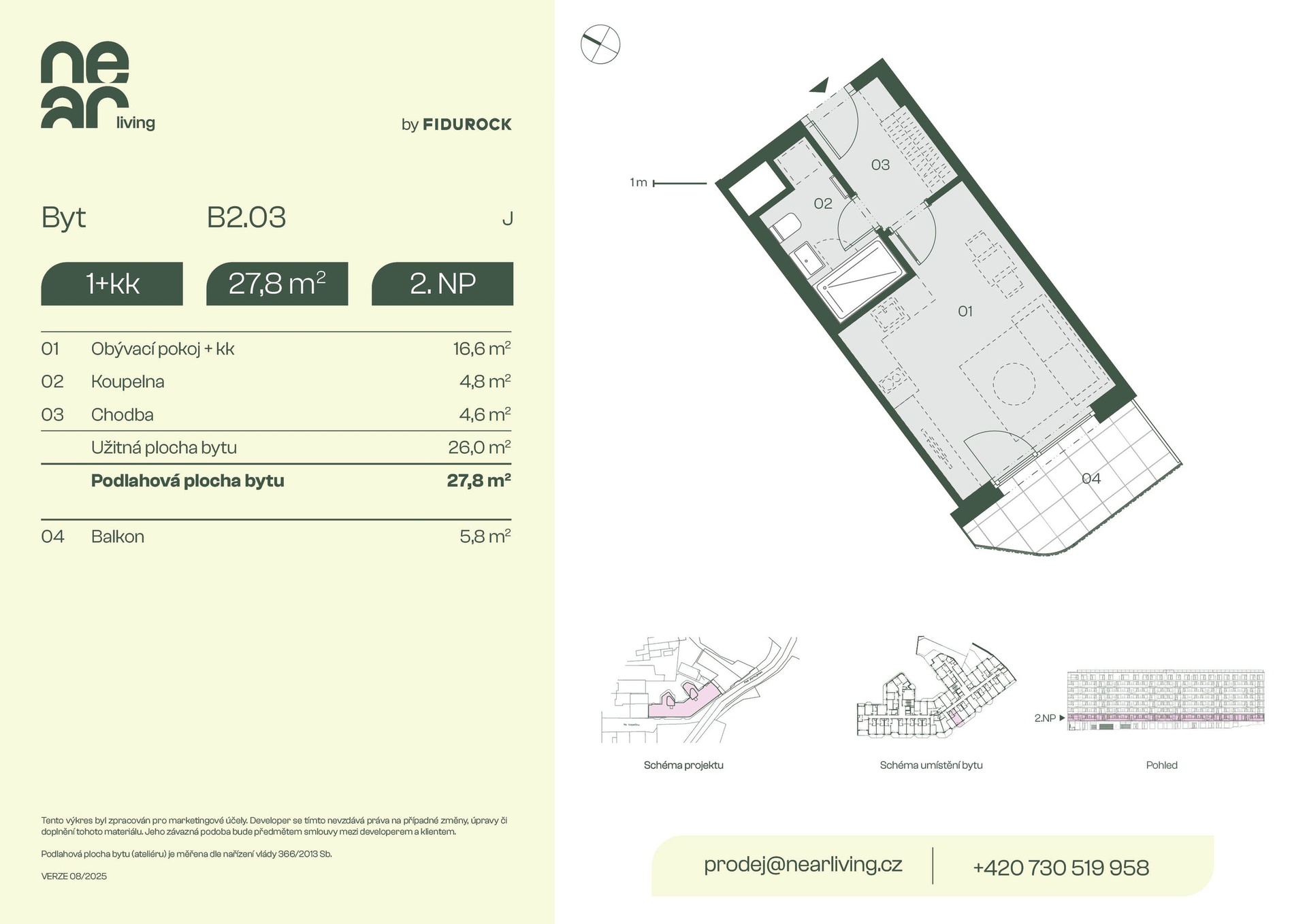 We are offering for sale a 1+kt apartment with a floor area of 27.8 sqm and a 5.8 sqm balcony in the NEAR living development project in Prague 8, located on the border between Palmovka and Karlín.