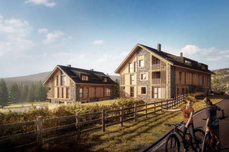 The chamber hot residence LAKA LIVING is being built in the heart of the Sumava National Park, in the picturesque village of Prášily. The property is located on the site of a former border company building and comprises a total of 20 luxury apartments with a layout of 1 + kk, 2 + kk and 3 + kk and unit sizes from 24.7 m² to 92.7 m² in two apartment buildings. The architecture of the project is fully in line with the local development and the location of the national park. Bright rooms with magnificent views of the mountain landscape are accentuated by the quality natural materials throughout the property.