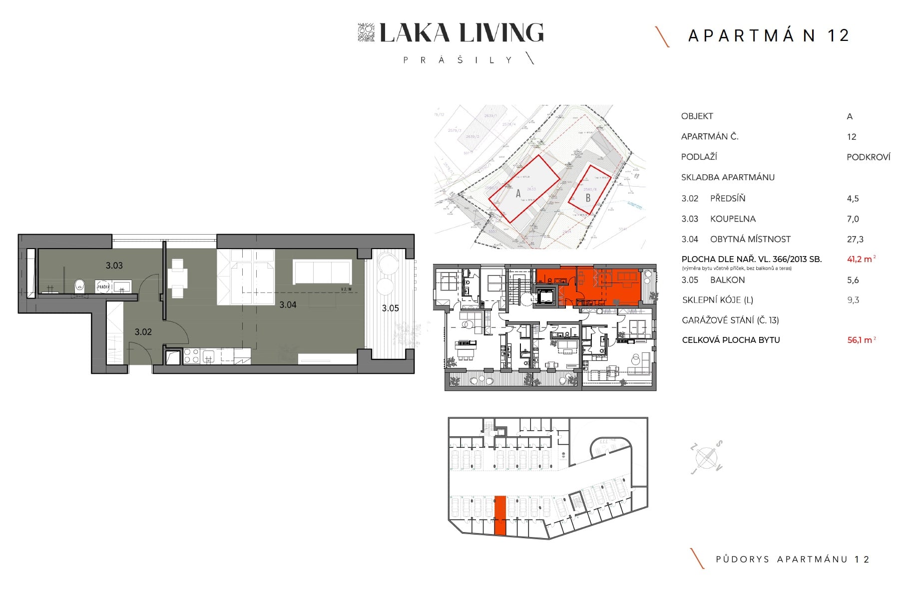 We offer for sale a luxury mountain apartment of 1+kk with a living area of 38.8 m² and a floor area of 41.2 m² with a balcony of 5.6 m². The apartment is located in the attic of the apartment house "A" in the newly emerging development project LAKA LIVING in Sumava. The apartment is oriented NE-SW. The apartment consists of a living room (27.3 m²), a bathroom with toilet (7 m²) and a hallway (4.5 m²).