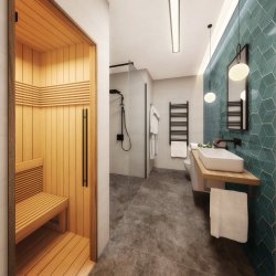 The apartment complex also includes a fitness and wellness area with a hot tub and sauna.