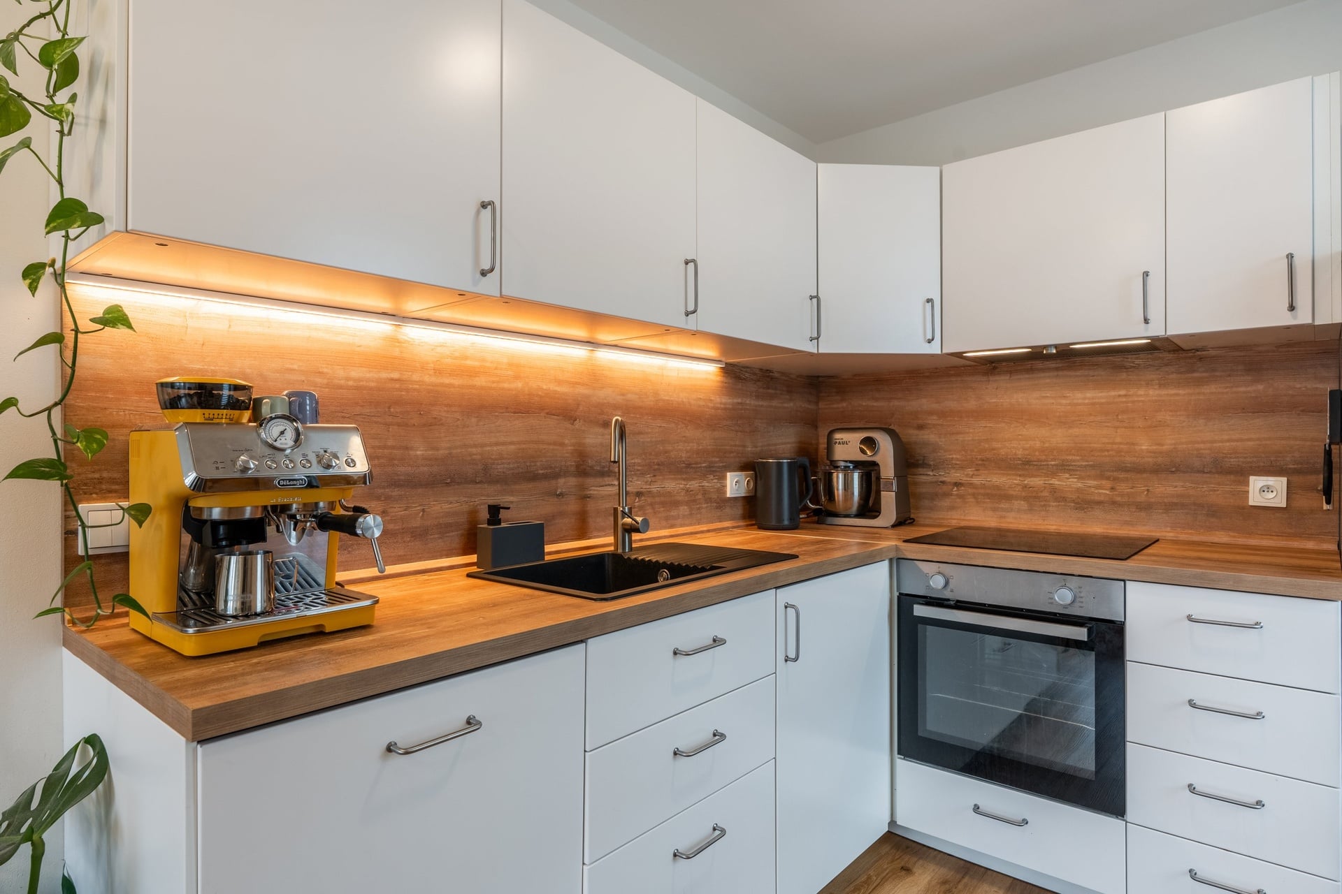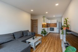 The layout is modern and functional. The living room with kitchenette forms an open and airy space for everyday life, while the separate bedroom offers a quiet retreat. The kitchen area has direct access to the loggia, which pleasantly expands the living space and provides a place to sit. The apartment also includes a practical storage room located outside the apartment, which provides ample storage space.