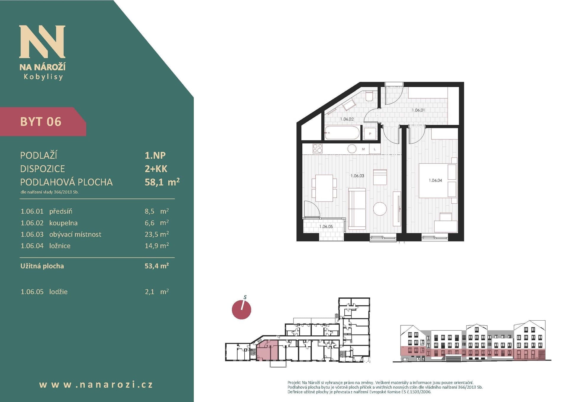 This 2+kt apartment will be built in the Na Nároží project in Prague's Kobylisy district on the ground floor of a modern apartment building within walking distance of the metro. The floor area of the apartment is 58.1 sqm, and the total area of the apartment including the loggia (2.1 sqm) is 55.5 sqm. The apartment includes a cellar, which is included in the price.