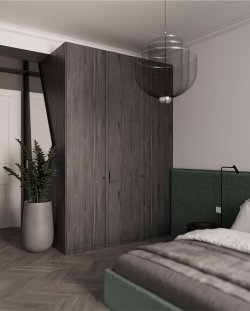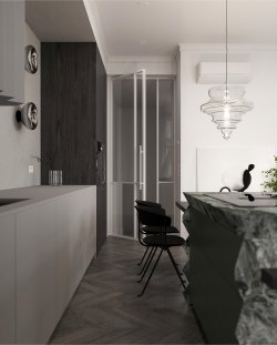 The total area of the unit is 54,5 m², and the apartment is designed to a high standard. The living space is complemented by FREVINI MONACO wooden flooring, laid in a chevron pattern. The interior doors combine classic wooden elements with steel glass doors with textured and clear glass, emphasizing the modern character of the space. The apartment includes a cellar.