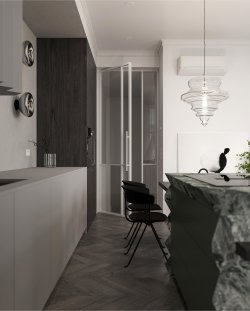 The total area of the unit is 46,6 m², and the apartment is designed to a high standard. The living space is complemented by FREVINI MONACO wooden flooring, laid in a chevron pattern. The interior doors combine classic wooden elements with steel glass doors with textured and clear glass, emphasizing the modern character of the space. The apartment includes a cellar.