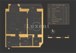 The apartment has two rooms of 30.6 sqm and 18.9 sqm oriented east to Čs. army. The main larger room is prepared as a living room with a kitchenette. The room is accessed from the corridor of 8.6 sqm. The hallway also leads to a bathroom with a toilet of 6.8 sqm. Behind the larger room is the bedroom, adjoined by a spacious dressing room of 4.4 sqm. From here one can access the 4.4 sqm balcony. The apartment has a cellar of 1.7 sqm, which is included in the price of the apartment.