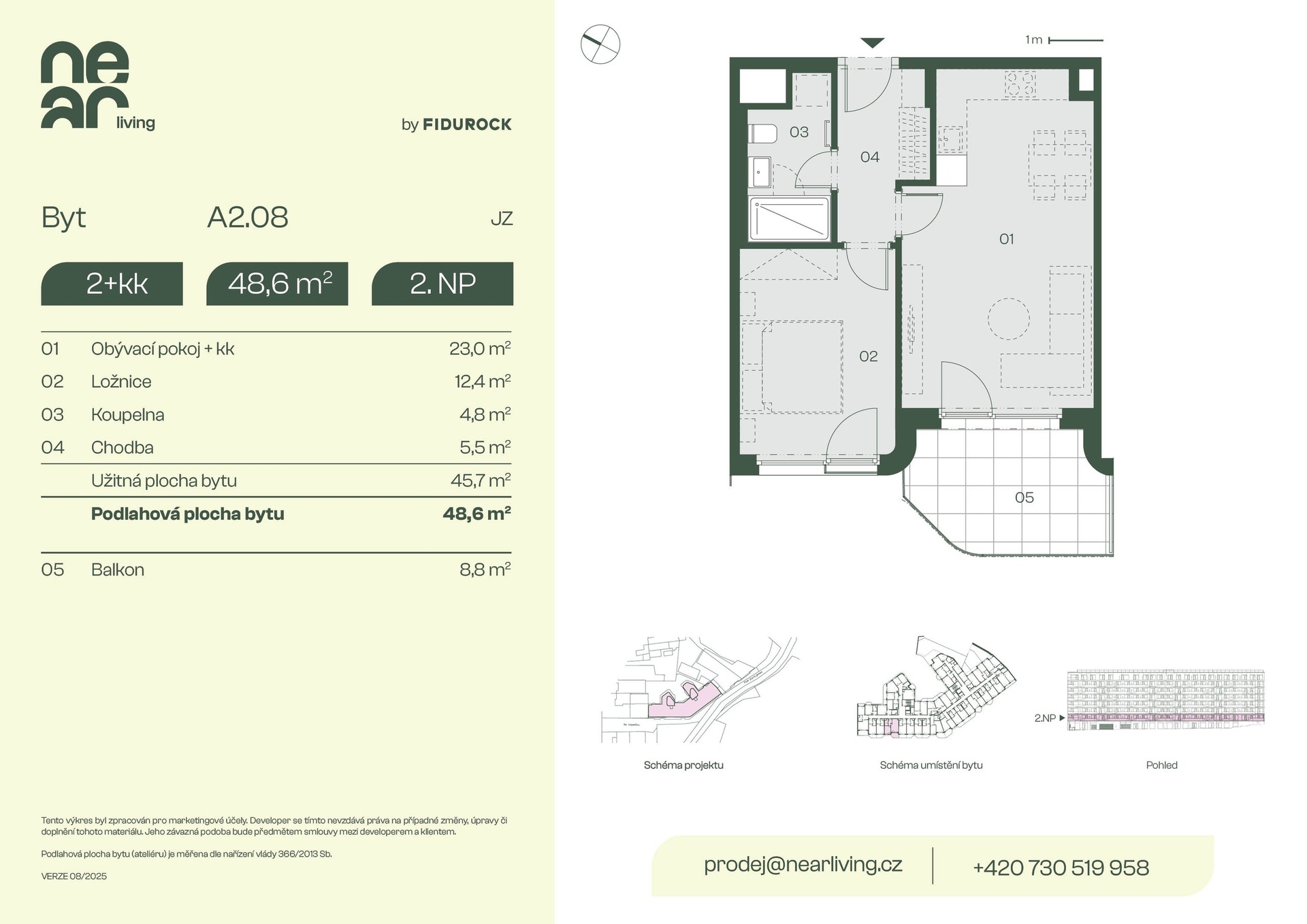 We are offering for sale a 2+kt apartment with a floor area of 48.6 sqm and an 8.8 sqm balcony in the NEAR living development project in Prague 8, located on the border between Palmovka and Karlín.