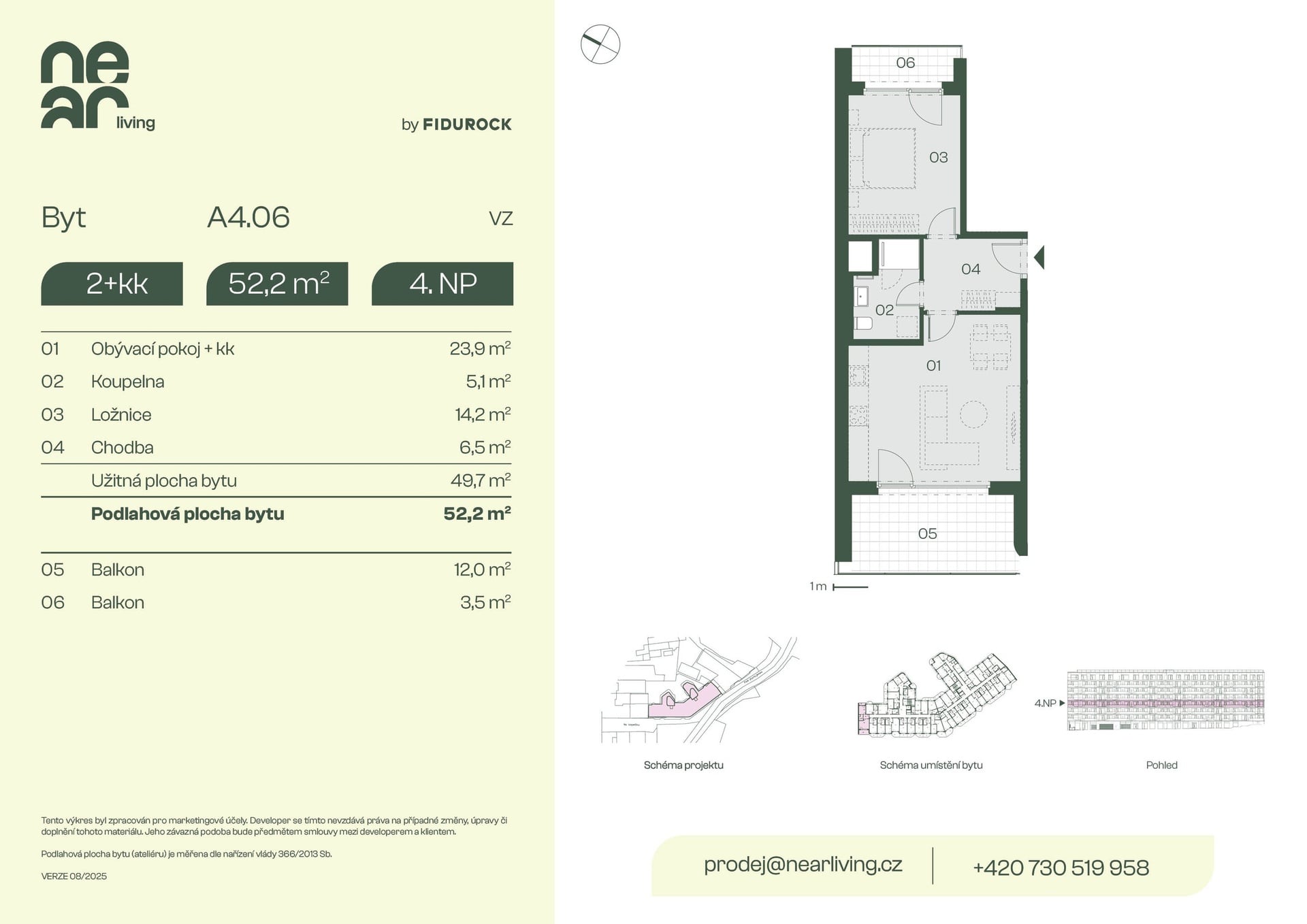 We offer for sale a 2+kt apartment with a floor area of 52.2 sqm with balconies of 12 sqm and 3.5 sqm in the NEAR living development project in Prague 8, located on the border of Palmovka and Karlín.