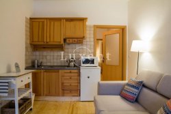 There is a living room with a kitchenette and a terrace exit that is common for five apartments. Connection to TV antenna available. The kitchenette is equipped (fridge, stove, microwave, coffee maker, dishes). In the bedroom a comfortable space for two beds, a stylish wood-paneled wall and storage space. The bathroom has a shower and ceramic tiles. Central heating (heat and hot water at any time immediately). Low annual costs of approximately 13,500 CZK (including energy and FO).