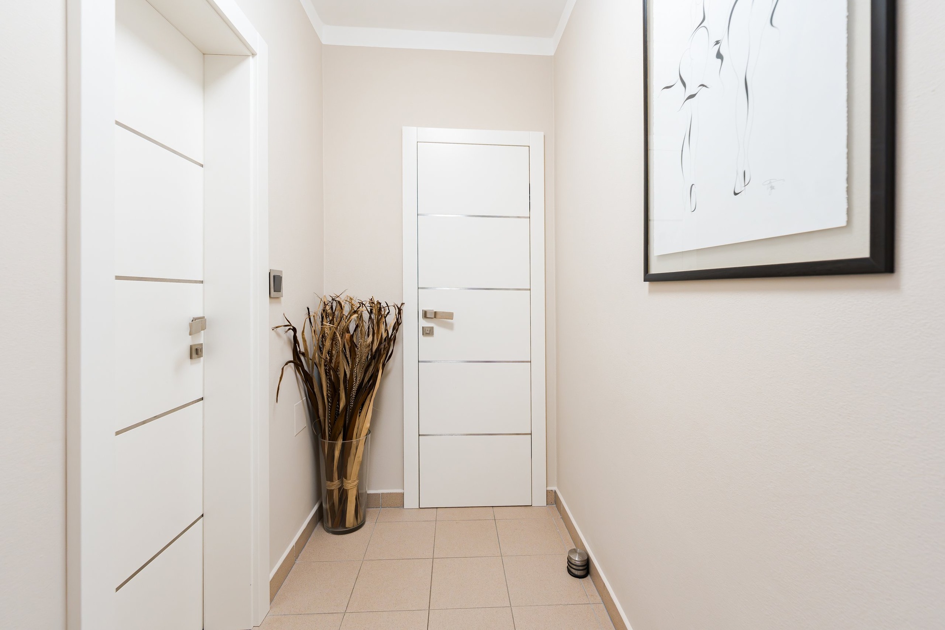 The apartment includes a parking space in the underground garage and a cellar. The layout includes a living room with a sofa bed, a kitchenette equipped with all appliances, a bedroom with a double bed, a bathroom with a bathtub and sink, and a separate toilet. The apartment is sold fully furnished to a high standard. Built-in storage space. High-quality Quantum bed. Terrace with outdoor seating and barbecue. The bathroom includes a washing machine and dryer.