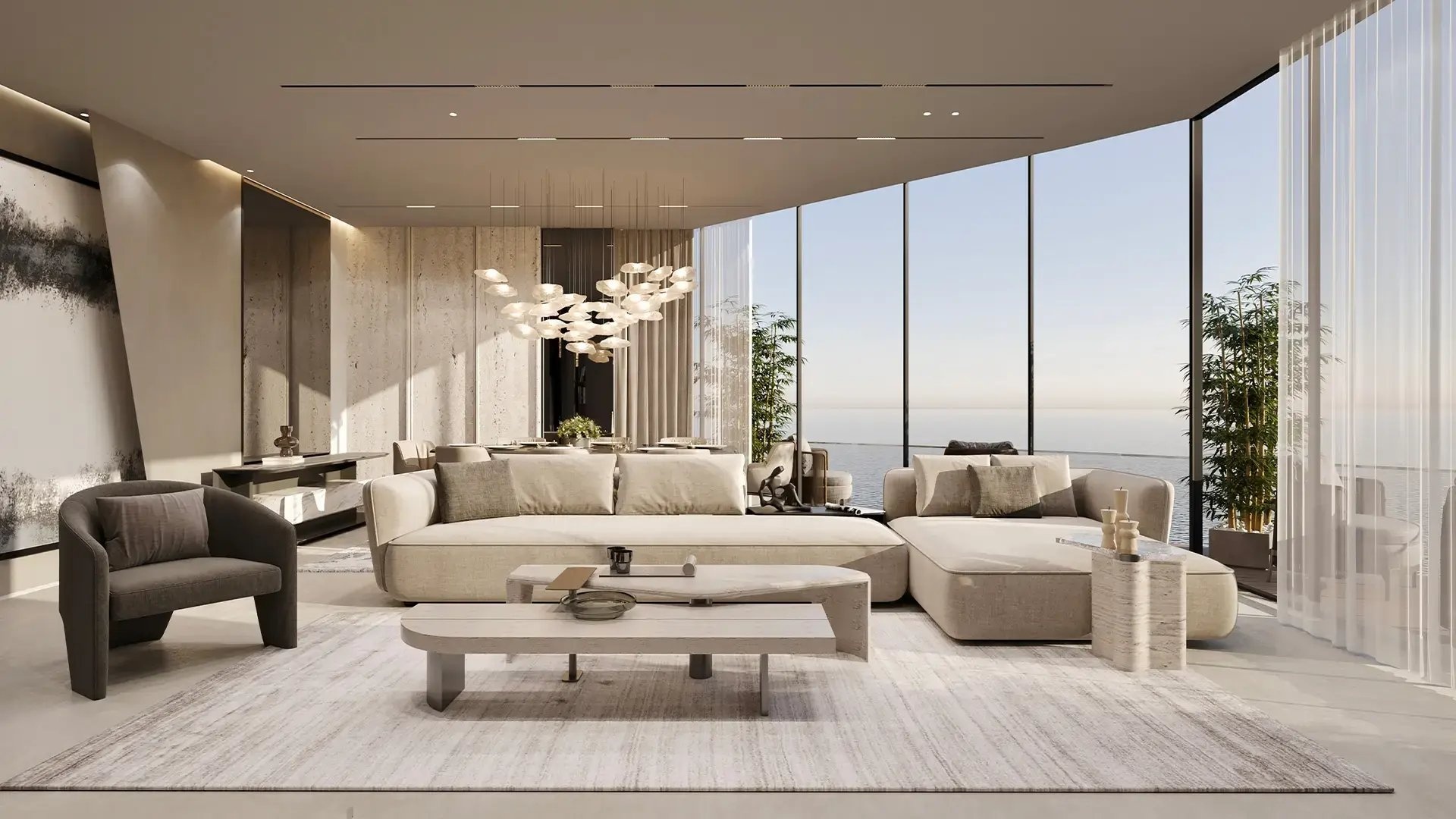 The residential complex consists of three elegant mid-rise towers with a total of 820 fully equipped and serviced residences. The apartment is designed with an emphasis on functional layout, quality materials, and a natural color palette that underscores the bright and airy character of the interior. The unit includes a terrace and a view of the sea or lagoon, which naturally expands the living space and strengthens the connection with the surrounding landscape.