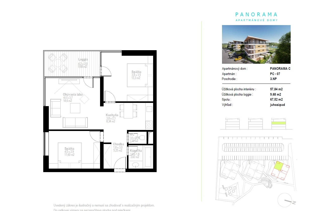We offer for sale apartment 3+kt in new residence Marina Liptov located in the surroundings of majestic mountains, picturesque national parks and the longest Slovak dam Liptovská Mara. The apartment is located on the 2nd floor and has a living area of 58 sqm and a total usable area of 68 sqm. The layout of the apartment offers a living room with kitchenette, two bedrooms and a bathroom, the apartment also has a loggia of 9.7 sqm accessible from the living room and bedroom. The house has wheelchair access and an elevator, each apartment has a parking space and a cellar, which are already included in the price.