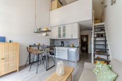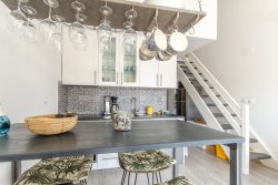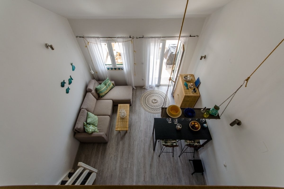 This cozy two-story apartment with a total area of 64 m² is located just 10 meters from the sea and offers unobstructed views of the bay and the historic city center. The lower floor consists of a living room with a kitchen and dining area, from which there is access to a spacious 10.7 m² balcony with an open view of the sea. There is also one bedroom and a bathroom. On the upper floor, there is a second bedroom in an open gallery.